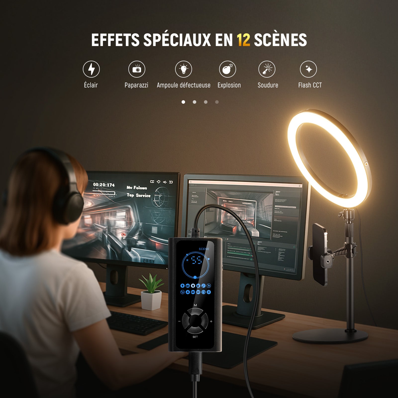 - 12 effets de scène : Éclair, Paparazzi, Ampoule défectueuse, Explosion, Soudage, Scintillement CT, Impulsion CT, Bougie, Cycle CT, Cycle de luminosité, Écran, Fête, Feux d’artifice