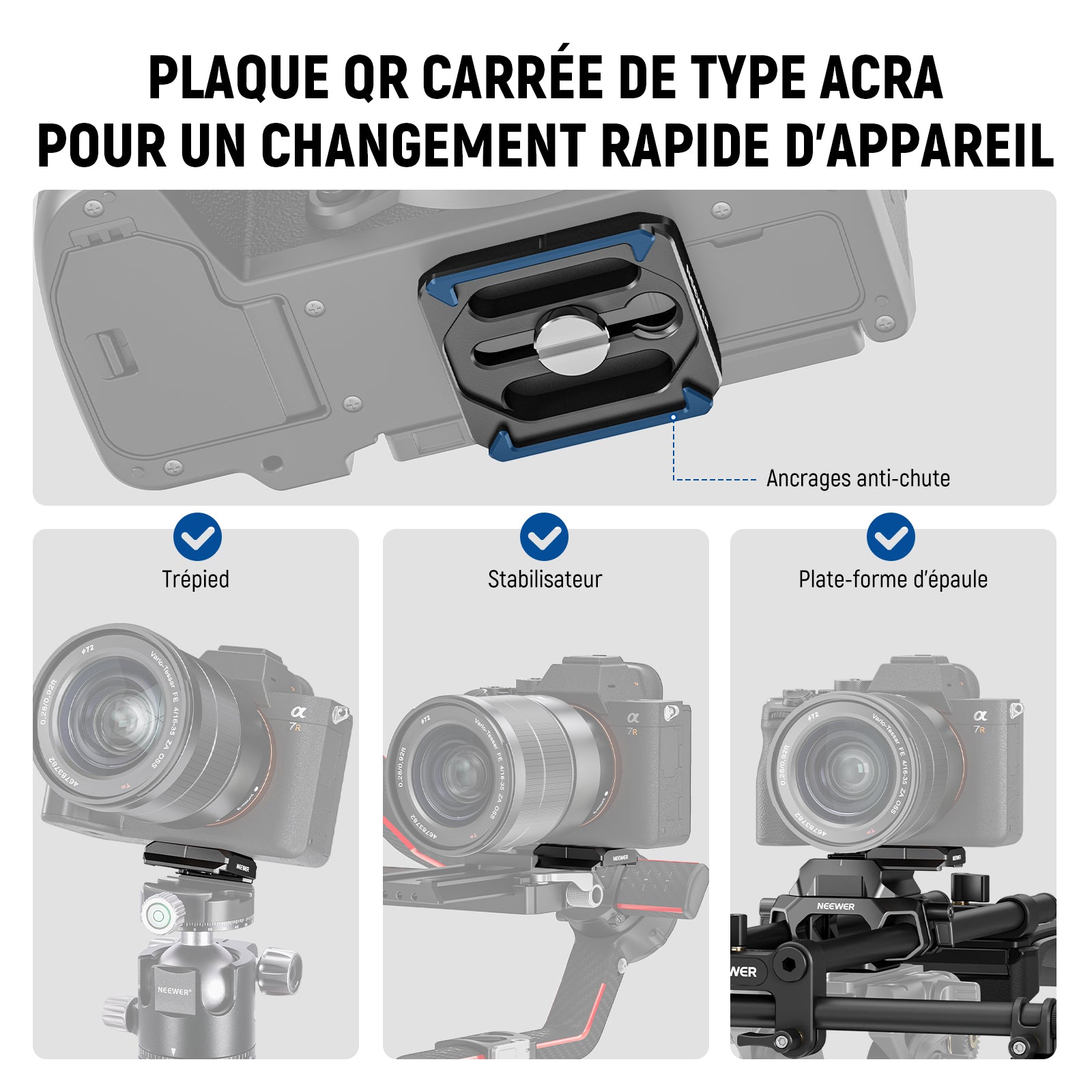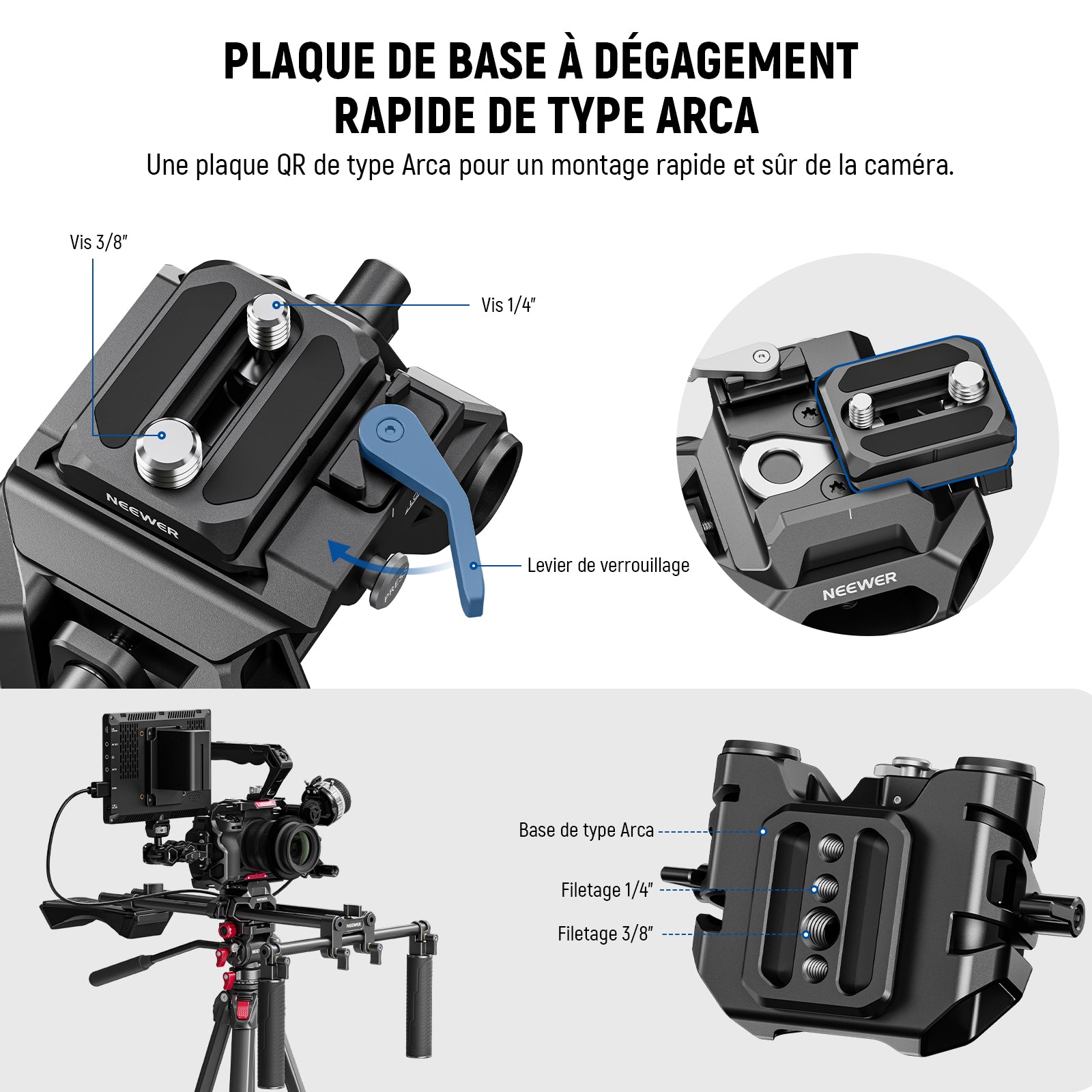 • 【Plaque et pince QR de type Arca triple sécurité】 La plaque QR avec un design ancré anti-chute et un coussinet en caoutchouc, et la base de serrage avec une broche rétractable offrent une triple sécurité pour le support de caméra via les vis 1/4" 3/8". Charge maximale : 11 lb (5 kg). Vous pouvez monter une cage avec une base Arca directement sur la pince, ou ajouter une stabilité supplémentaire en la fixant d'abord à la plaque QR, compatible avec les cages de caméra SmallRig
