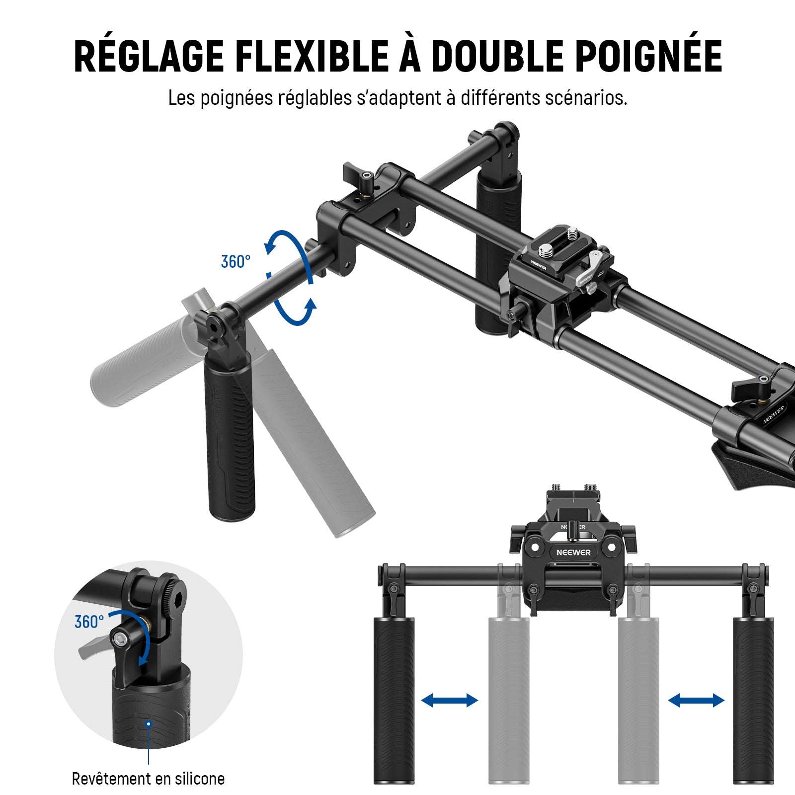 • 【Poignées confortables à double poignée et support d'épaule】 Fabriqué en mousse hautement élastique, l'épaulière ergonomique soulage les douleurs à l'épaule et vous permet d'ajuster le centre de gravité en le faisant glisser à travers les tiges verticales. Plusieurs trous filetés de 1/4" sont destinés à l'installation d'accessoires. Les deux poignées recouvertes de silicone souple sur la barre transversale horizontale permettent un réglage précis de la distance et une rotation à 360°