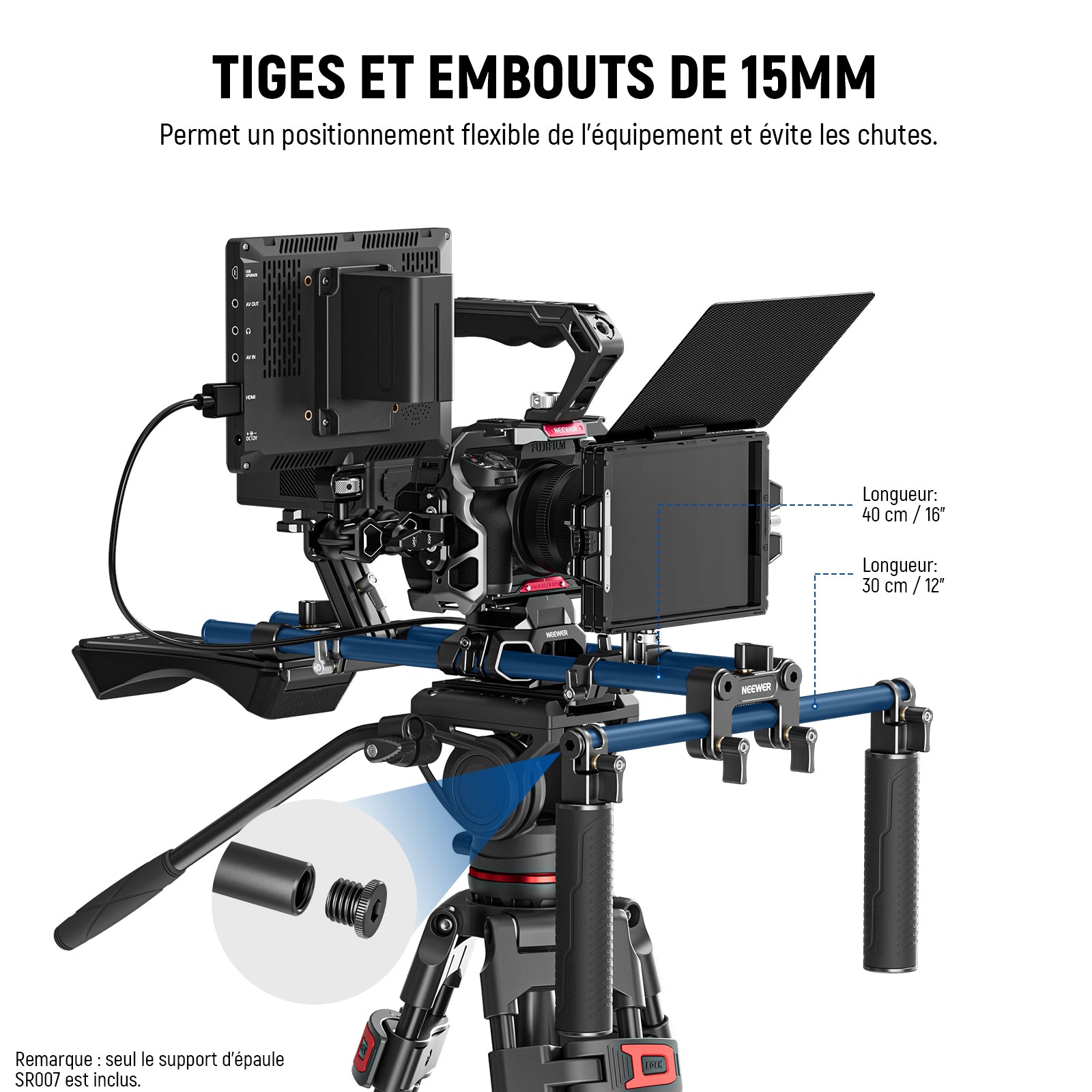• 【Tiges étendues de 15mm avec bouchons à vis】 Trois tiges de 15mm sont incluses : deux barres verticales de 16" (40cm) et une barre transversale de 12" (30cm). Tiges verticales étendues avec espace de réglage avant et arrière pour la plaque de base du support de caméra, les épaulettes, les poignées et autres accessoires. Les deux extrémités des tiges sont dotées de bouchons à vis amovibles pour les empêcher de tomber et augmenter la sécurité lors de l'utilisation