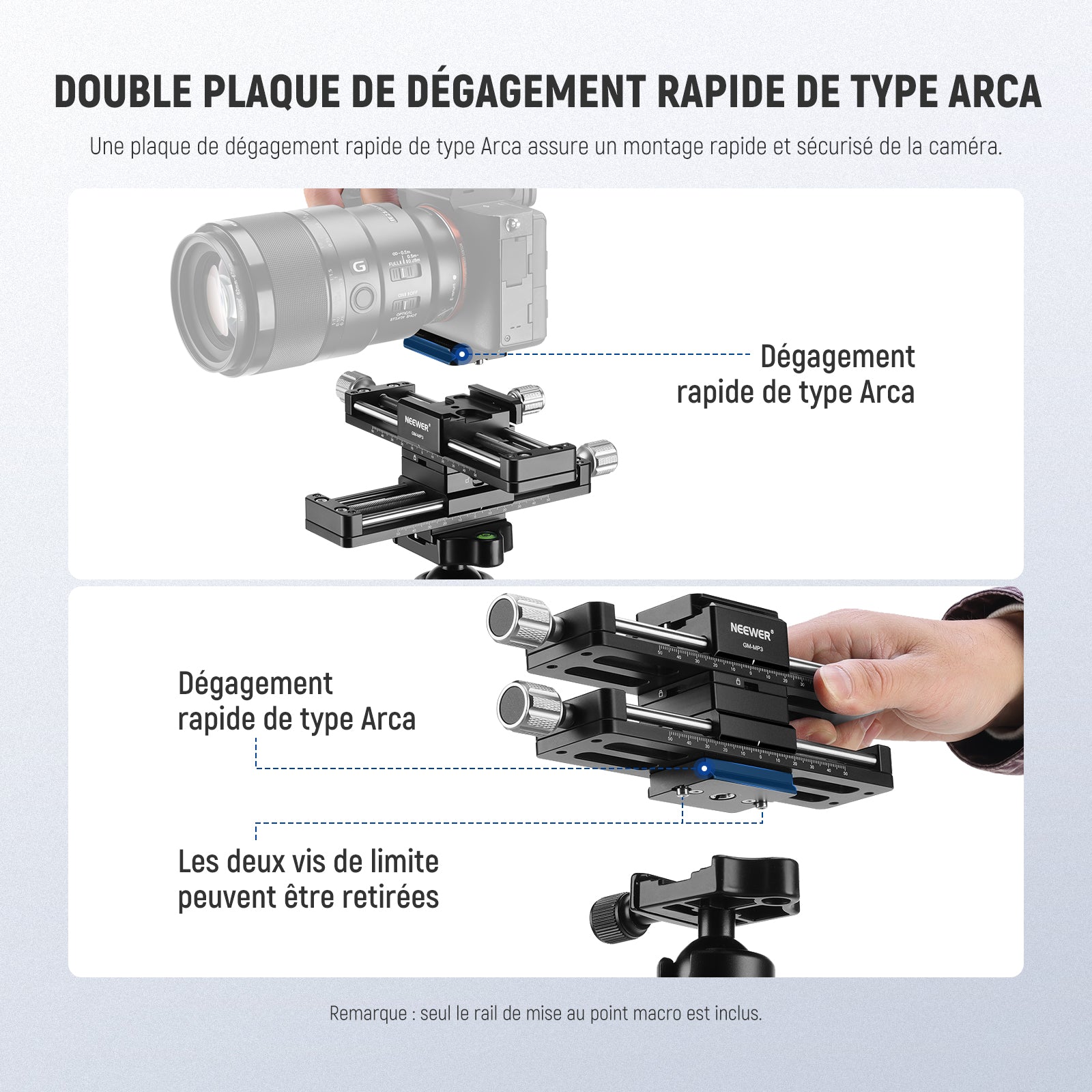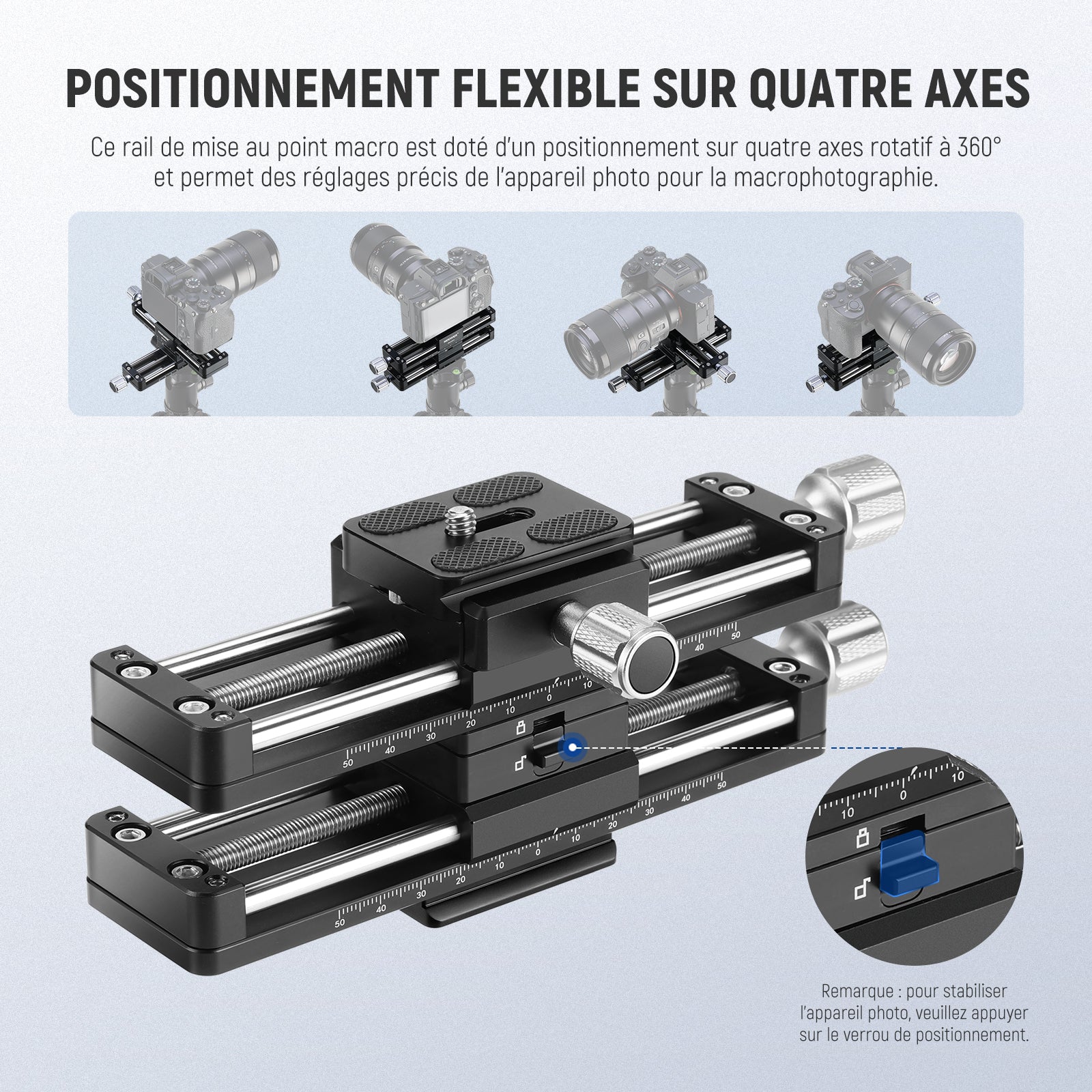 - 【Conçu pour la macrophotographie】Avec un positionnement flexible sur 4 axes et une rotation à 360°, ce rail de mise au point macro professionnel est conçu pour une mise au point rapide et précise de l'appareil photo, idéal pour la macrophotographie, les gros plans et les vidéos en accéléré où les mouvements précis de l'appareil photo sont cruciaux