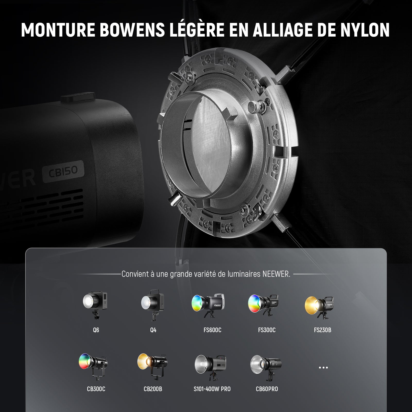 - 【Monture Bowens standard】Parfaitement compatible avec Godox SL60w compatible avec Aputure 120D 60D compatible avec Amaran 100x 150c 600d NEEWER Q4 Vision 4 CB200B RGB CB60 MS60B MS60C MS150B S101-300WPRO/400W Pro et autres lampes stroboscopiques de studio à monture Bowens et lampes vidéo LED continues. Idéal pour les créateurs de contenu, les photographes et les vidéographes, et pour les influenceurs, il est indispensable d'avoir un équipement d'éclairage photo & vidéo.