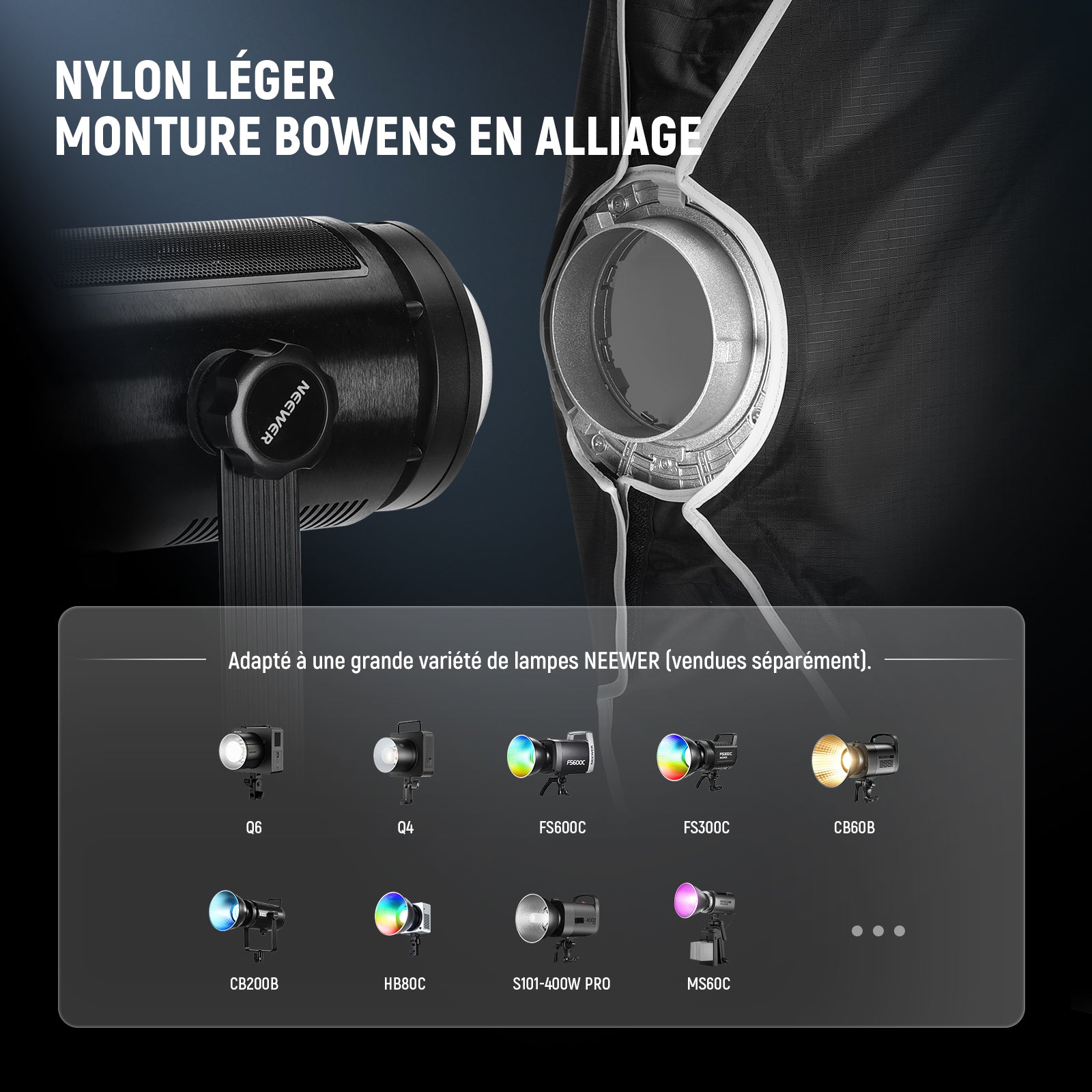 - 【Fixation via monture Bowens】 Connexion via monture Bowens, la softbox comme équipement de photographie est compatible avec Aputure Amaran 150c, compatible avec Godox SL60w, compatible avec SmallRig RC 120D RC 120B et NEEWER FS600C FS300C FS230C FS150C FS300B FS230B FS150B CB200C HB80C CB60B MS60B MS60C Q6 Q4 Q200 Q300 S102 S101-400W PRO, et d'autres lumières stroboscopiques de studio et lumières vidéo LED continues avec monture Bowens, pour l'éclairage de la photographie et de la vidéographie