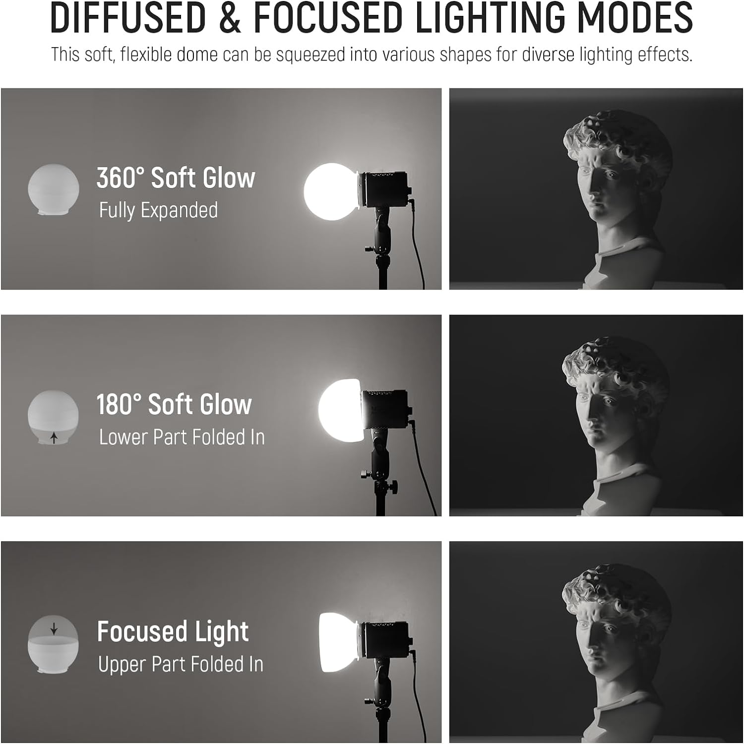 - 【Modes d'éclairage diffus et focalisé 】 Ce dôme doux et flexible peut être pressé dans différentes formes pour divers effets d'éclairage. Généralement, il prend en charge un éclairage diffus à 360° lorsqu'il est complètement déployé, un éclairage diffus à 180° lorsque la partie inférieure est repliée vers l'intérieur, ou un éclairage focalisé lorsqu'il est replié vers l'intérieur de la partie supérieure.