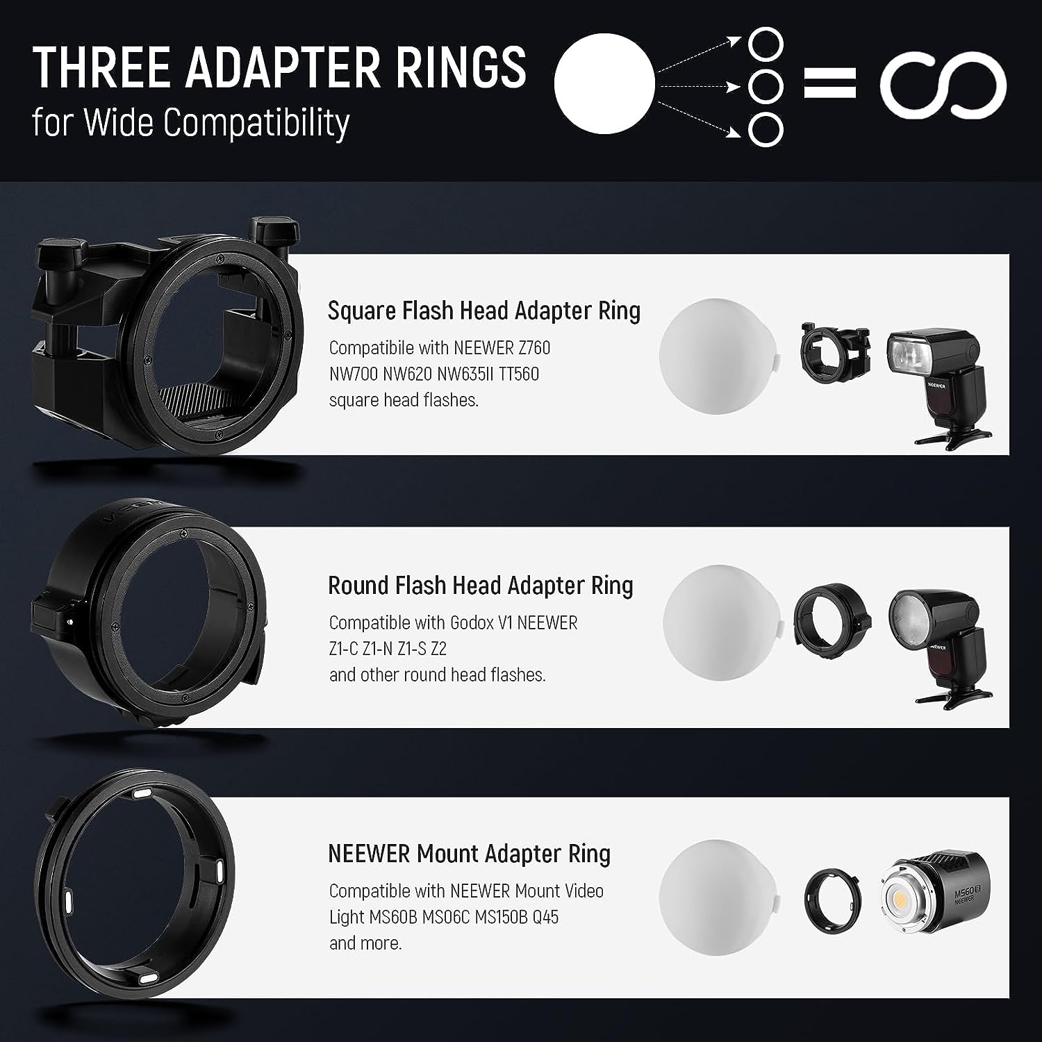 - 【Trois anneaux adaptateurs inclus】 Montez sans effort sur des têtes carrées, rondes ou d'autres flashs externes et sources d'éclairage continu avec les anneaux adaptateurs correspondants. Compatible avec NEEWER Z1-C Z1-N Z1-S Z2 flashs à tête ronde, compatible avec le flash à tête carrée NEWEER Z760 NW700 NW620 NW645II TT560 et compatible avec NEEWER Mount lampe vidéo MS60B MS06C MS150B Q45 et plus