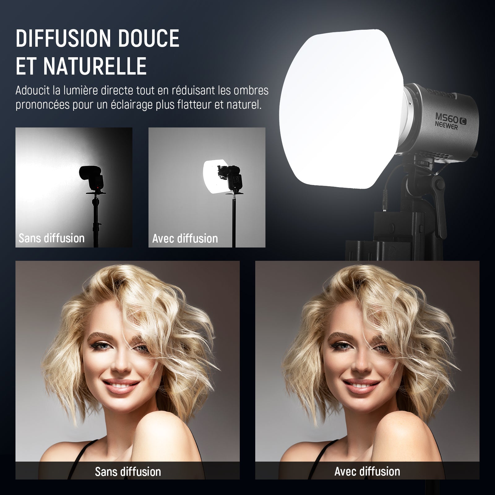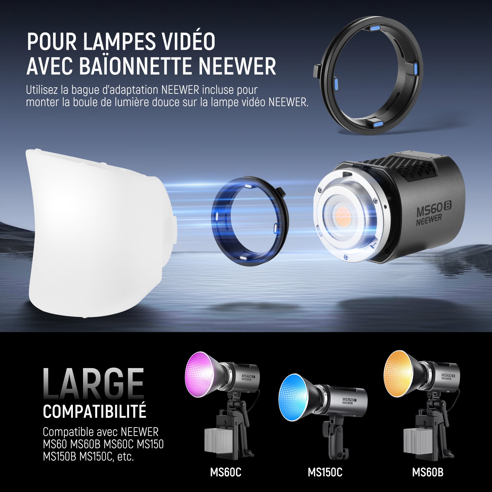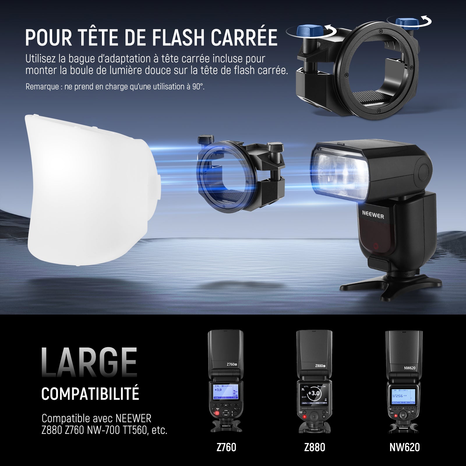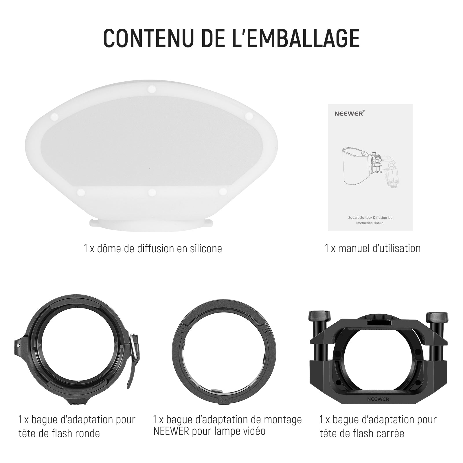 - Contenu de la livraison : 1 dôme de diffusion en silicone, 1 bague adaptateur de tête de flash carrée, 1 bague adaptateur de tête de flash ronde, 1 bague adaptateur Neewer pour lumière vidéo, et 1 manuel d'utilisation (français non garanti)
