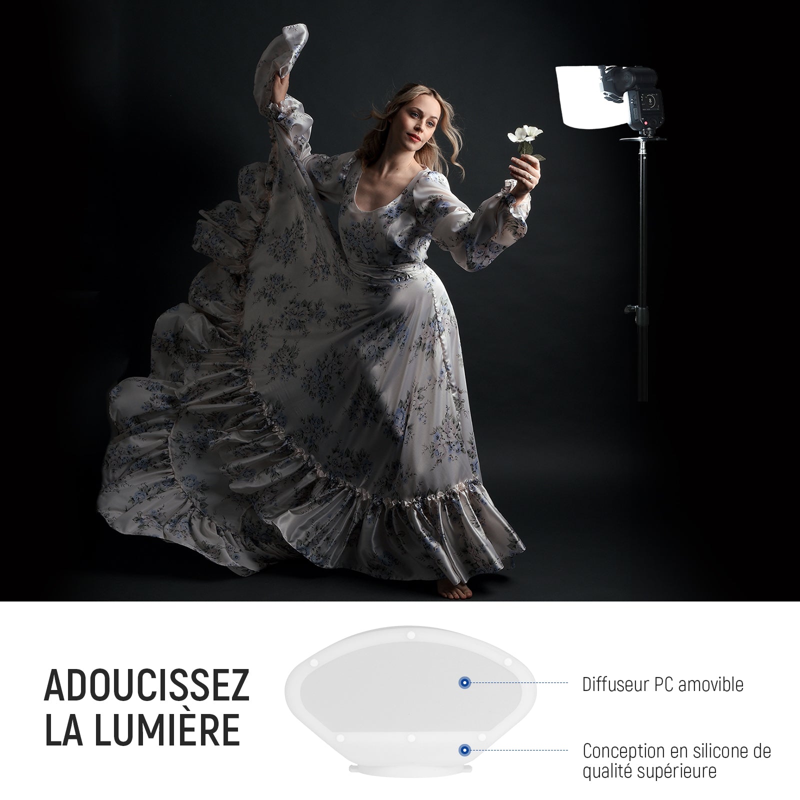 - Adoucit et diffusion naturelle : fabriqué en silicone de qualité supérieure, ce dôme de diffusion flash s'étend à une taille complète de 197 x 125 x 145 mm, offre juste la bonne quantité de transmission qui adoucit la lumière dure, réduit les ombres et fournit un éclairage naturel plus flatteur pour les mariages, les fêtes, les portraits, la photographie de produits, les séances photo de beauté et de mode. ts, studios, diffusion en direct Enregistrement vidéo, etc.