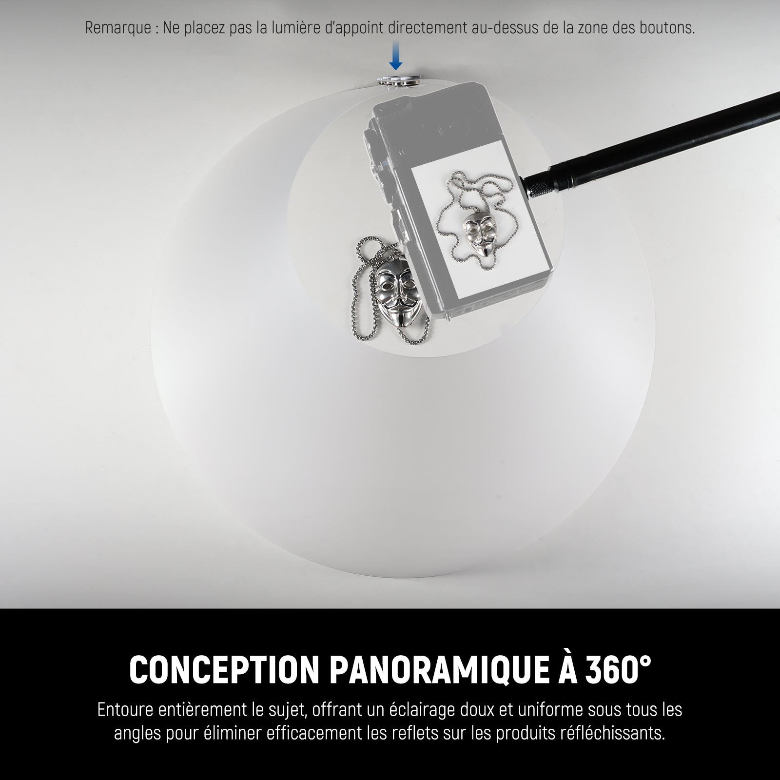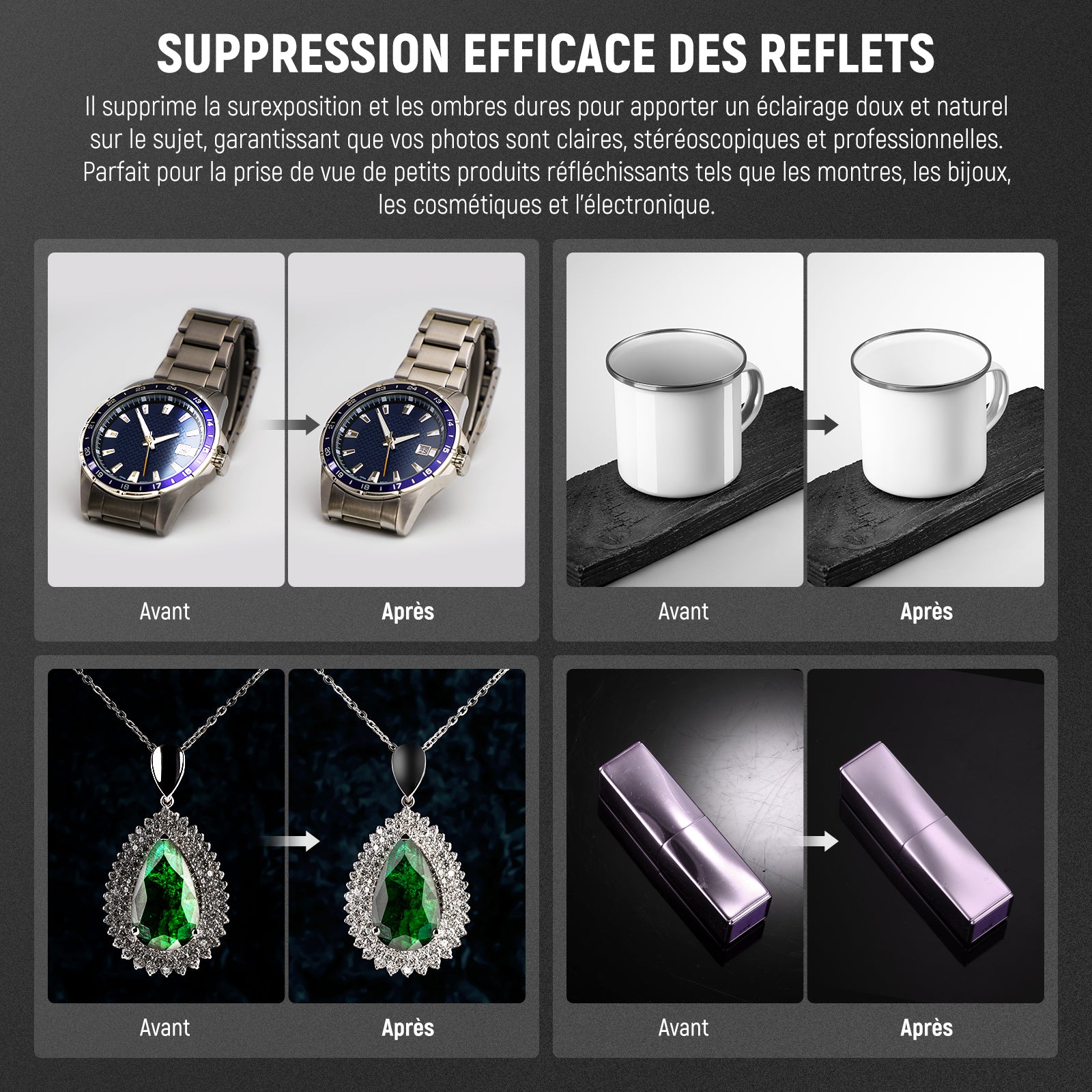 - 【360° Distribution de Lumière】 Les cônes lumineux diffusent uniformément l'éclairage intense, éliminent les ombres et minimisent les reflets sur les objets brillants. L'ouverture supérieure inclinée permet un accès de caméra facile, parfait pour le tournage en hauteur et les prises de vue à plat