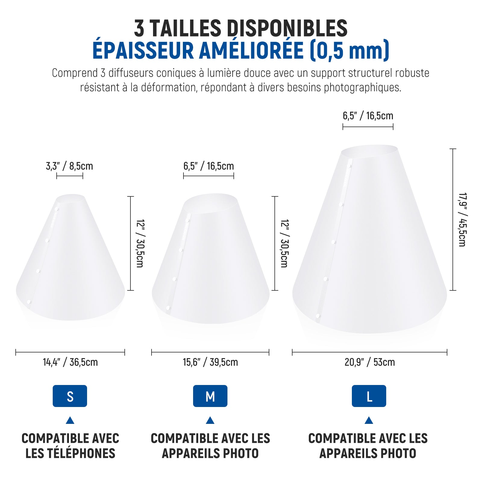 - 【Disponible en Trois Tailles】 Disponible en 14"/356mm, 15"/381mm et 20"/508mm, ce cône kit de lumière diffusion est adapté aux sujets variés tels que les accessoires, les montres, les cosmétiques, l'électronique domestique et d'autres articles réfléchissants. Le plus petit cône est compatible avec iPhone et Android pour la prise de vue de smartphone. Comme un équipement d'éclairage en continu, de photographie idéal, il est essentiel pour le créateur de contenu et l'influenceur de l'avoir
