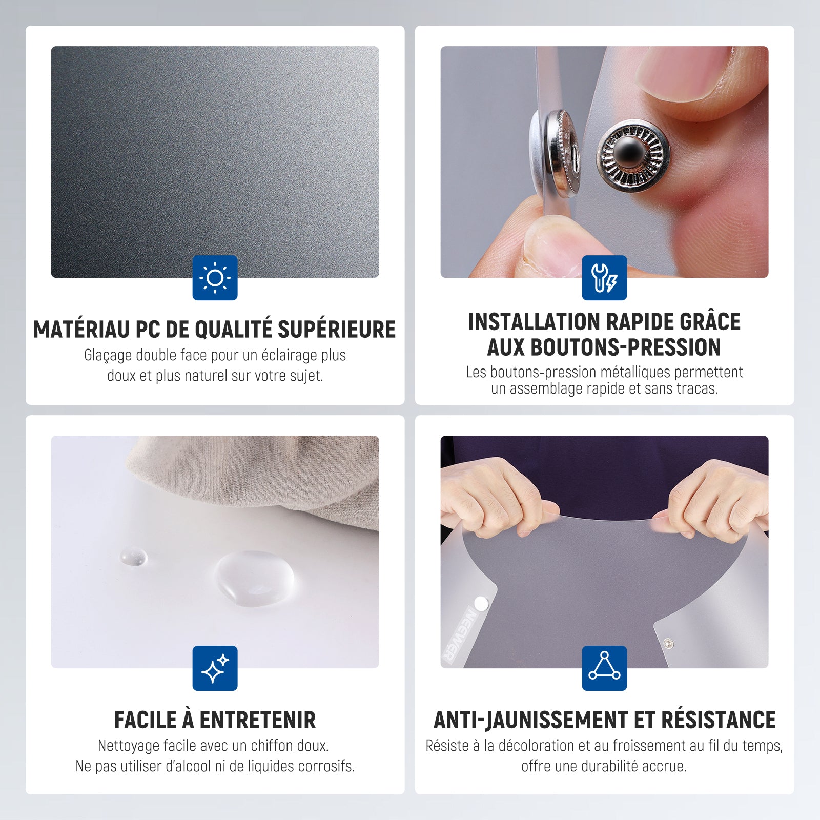 - 【Alternatives aux Photo Box】 Fabriqué en matériau PC épaissi de 0,5 mm, avec une haute transparence et résistance à la chaleur, ce kit de softbox conique NEEWER remplace les boîtes photo traditionnelles pour des photos de produits nettes et professionnelles, les shootings photo, l’enregistrement vidéo et le tournage. Un ensemble polyvalent de diffuseurs de lumière mini softbox, compatible avec des équipements tels que : lampes LED, flashes de studio, flashes déportés, speedlights, speedlites, et bien plus encore.
