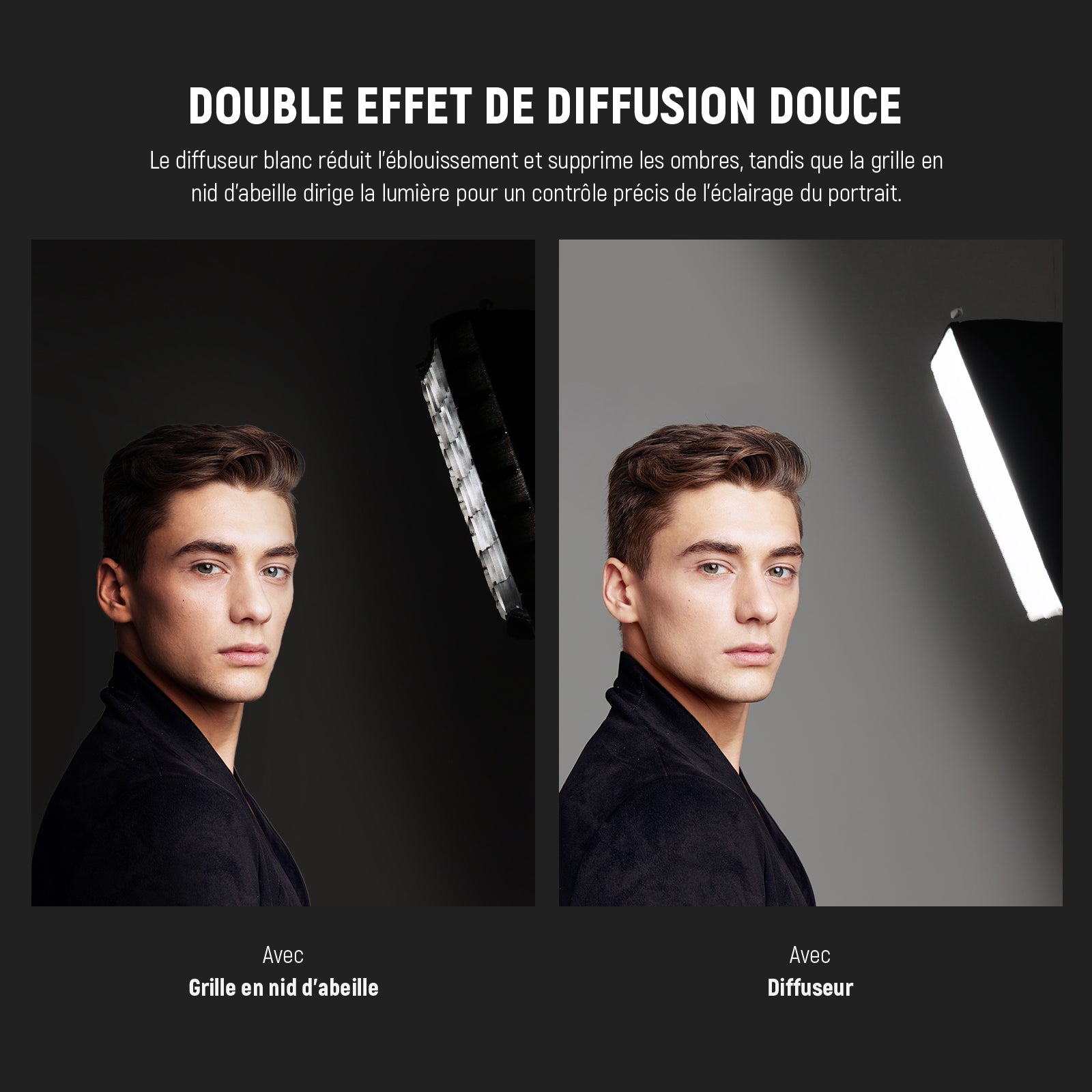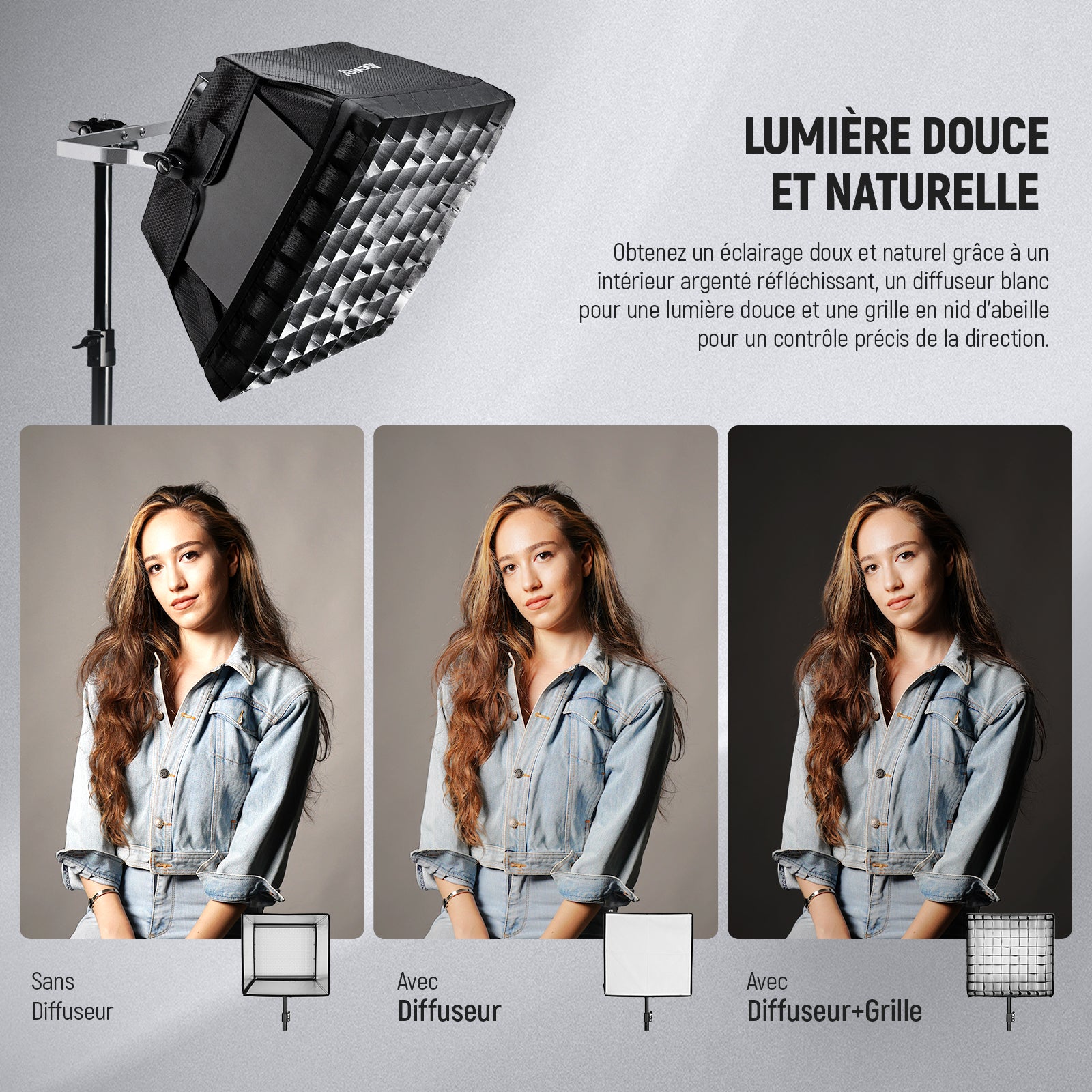 - 【Eclairage doux et naturel avec diffuseur et grille】 La surface interne argentée hautement réfléchissante et uniformément revêtue élargit et améliore la diffusion de la lumière tout en maintenant la précision des couleurs. Le diffuseur blanc inclus atténue les éblouissements et élimine les ombres indésirables. La grille en nid d'abeille concentre la lumière pour un effet d'éclairage de portrait doux mais bien défini, vous donnant un plus grand contrôle directionnel sur la sortie.