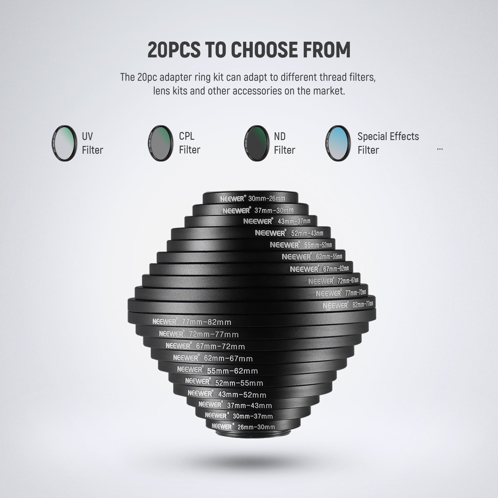 NEEWER Kit de 20 bagues d'adaptation pour filtre à lentille en métal noir anodisé