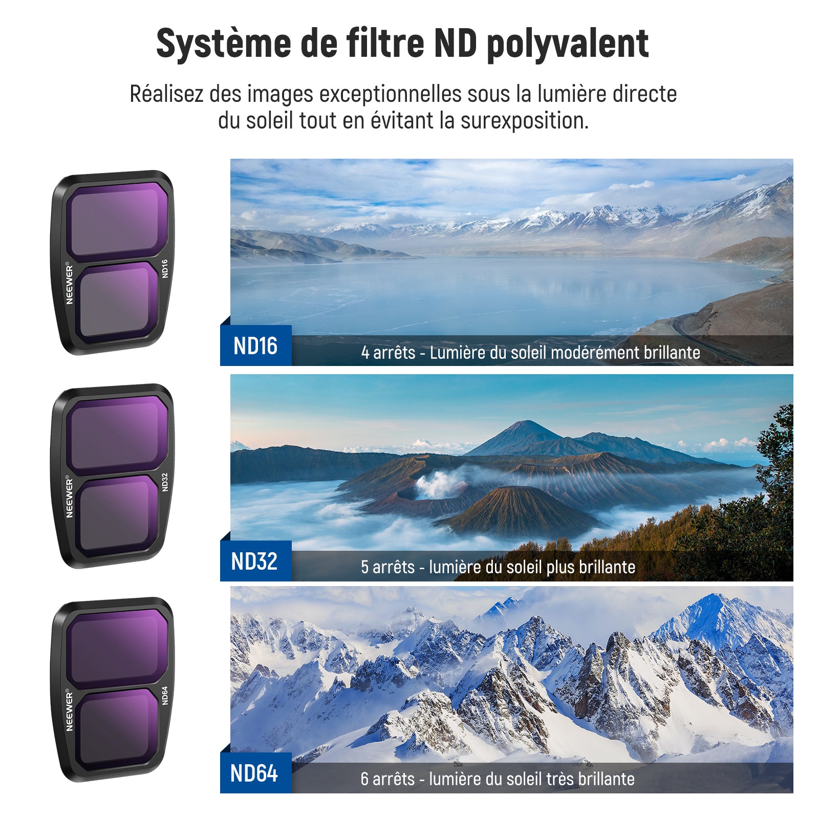 - 【Exposition équilibrée pour le paysage】 Les filtres d'objectif de drone ND16, ND32 et ND64 offrent différents niveaux de réduction de la lumière, allant de 4 à 6 arrêts. Ces filtres permettent un contrôle précis de l'exposition dans différentes conditions d'éclairage, permettant des effets créatifs comme le flou de mouvement et la faible profondeur de champ dans la photographie et la vidéographie par drone