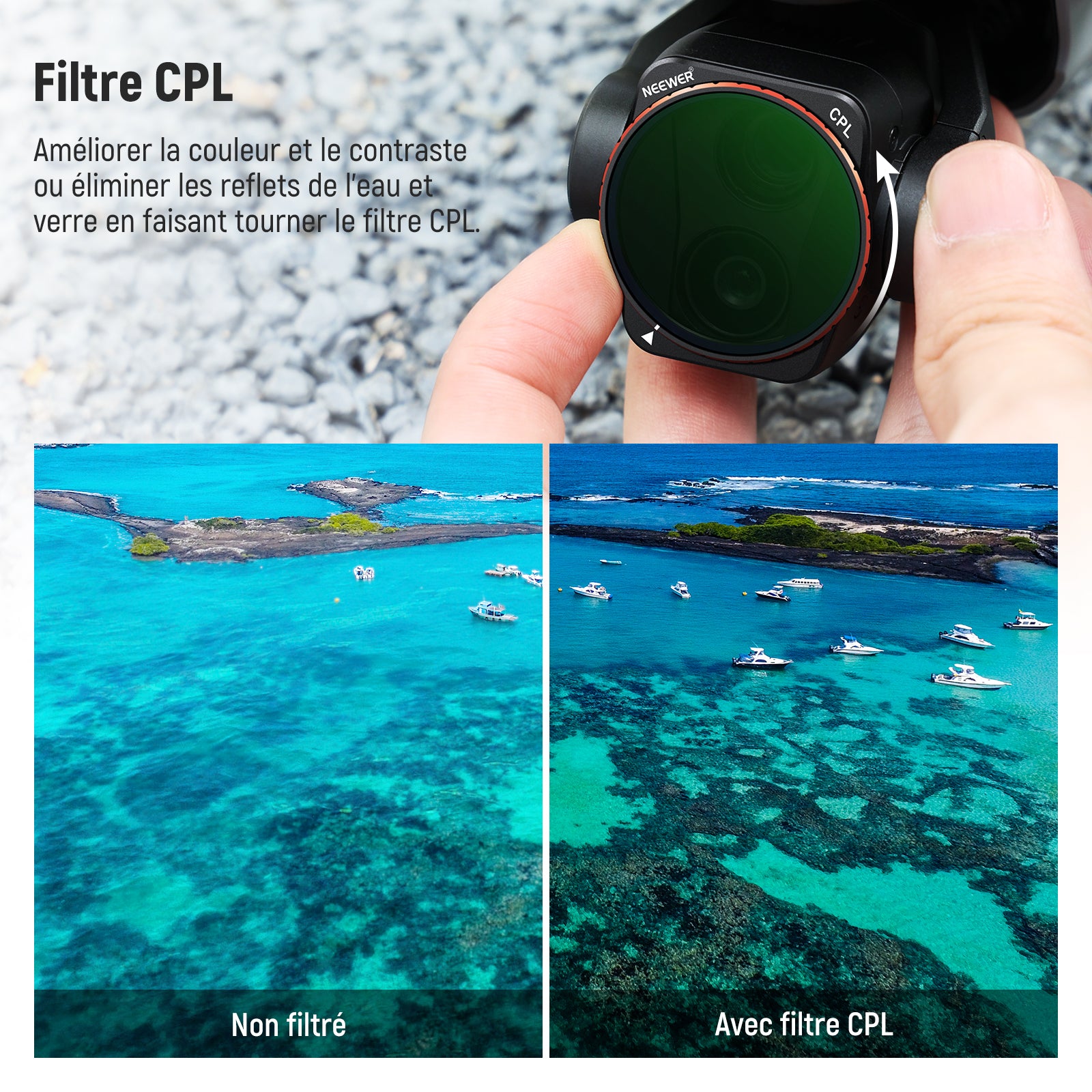- 【Reproduction de couleurs vives】 Ajoutez de l'éclat à vos prises de vue avec le filtre CPL inclus. Il aide à réduire l'éblouissement et les reflets indésirables des surfaces telles que l'eau, le verre et les objets métalliques, ce qui améliorera la couleur et la clarté de vos prises de vue aériennes, résultant en des images plus nettes et accrocheuses.