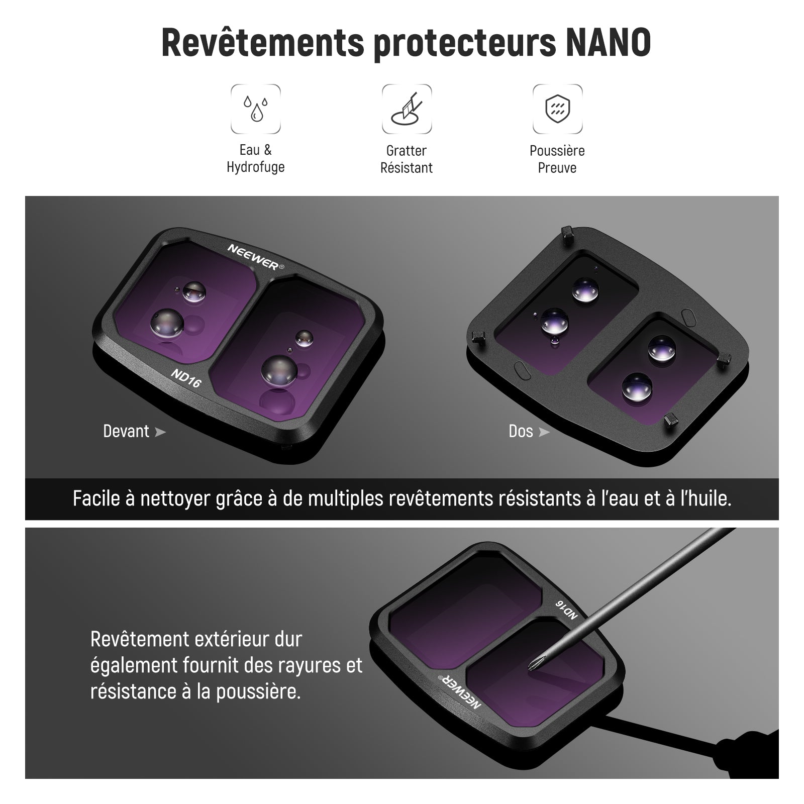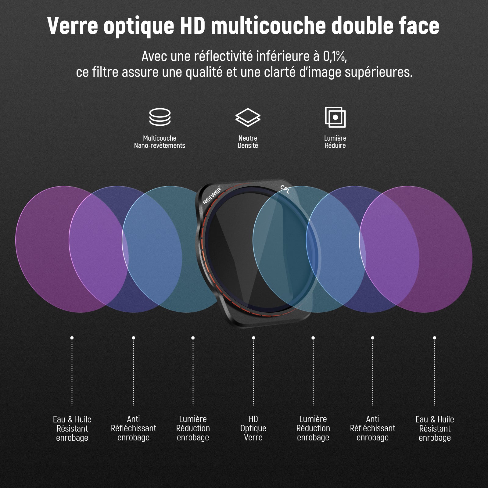 - 【Verre optique HD à revêtement NANO】Avec 30 couches de revêtements NANO multifonctionnels des deux côtés du verre optique HD, ces filtres sont hydrofuges, résistants aux rayures et à l'huile