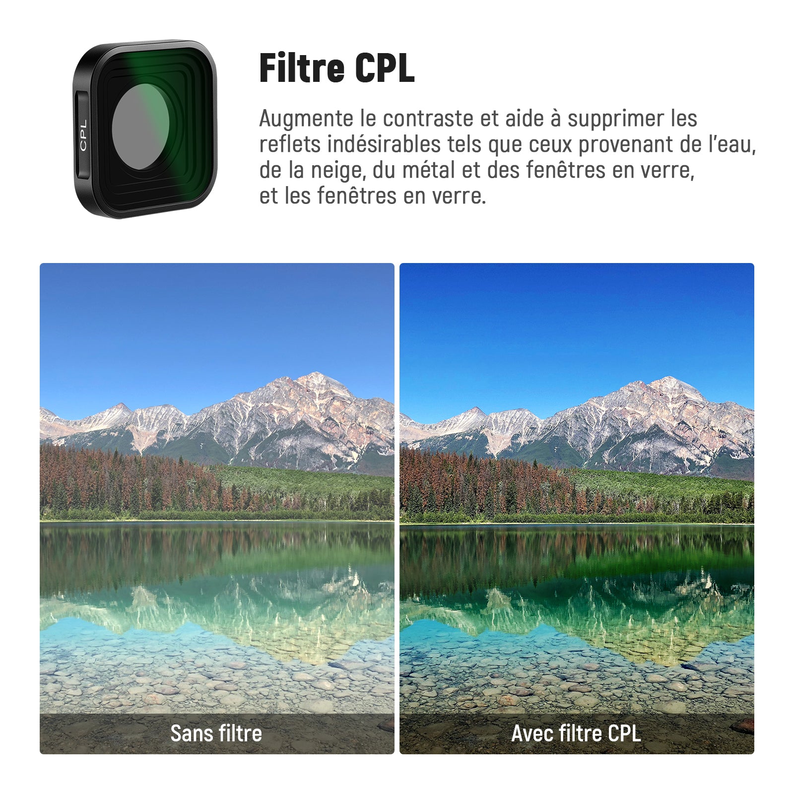 - 【Réduire le flare de l'objectif】Les filtres à densité neutre réduisent la lumière pour diminuer les risques de surexposition. Le filtre polarisant augmente le contraste tout en éliminant les reflets et les éblouissements. Le filtre CPL est à un niveau prédéfini et peut empêcher les reflets inutiles des surfaces réfléchissantes (comme l'eau, la neige et même les fenêtres en verre) sans rotation.