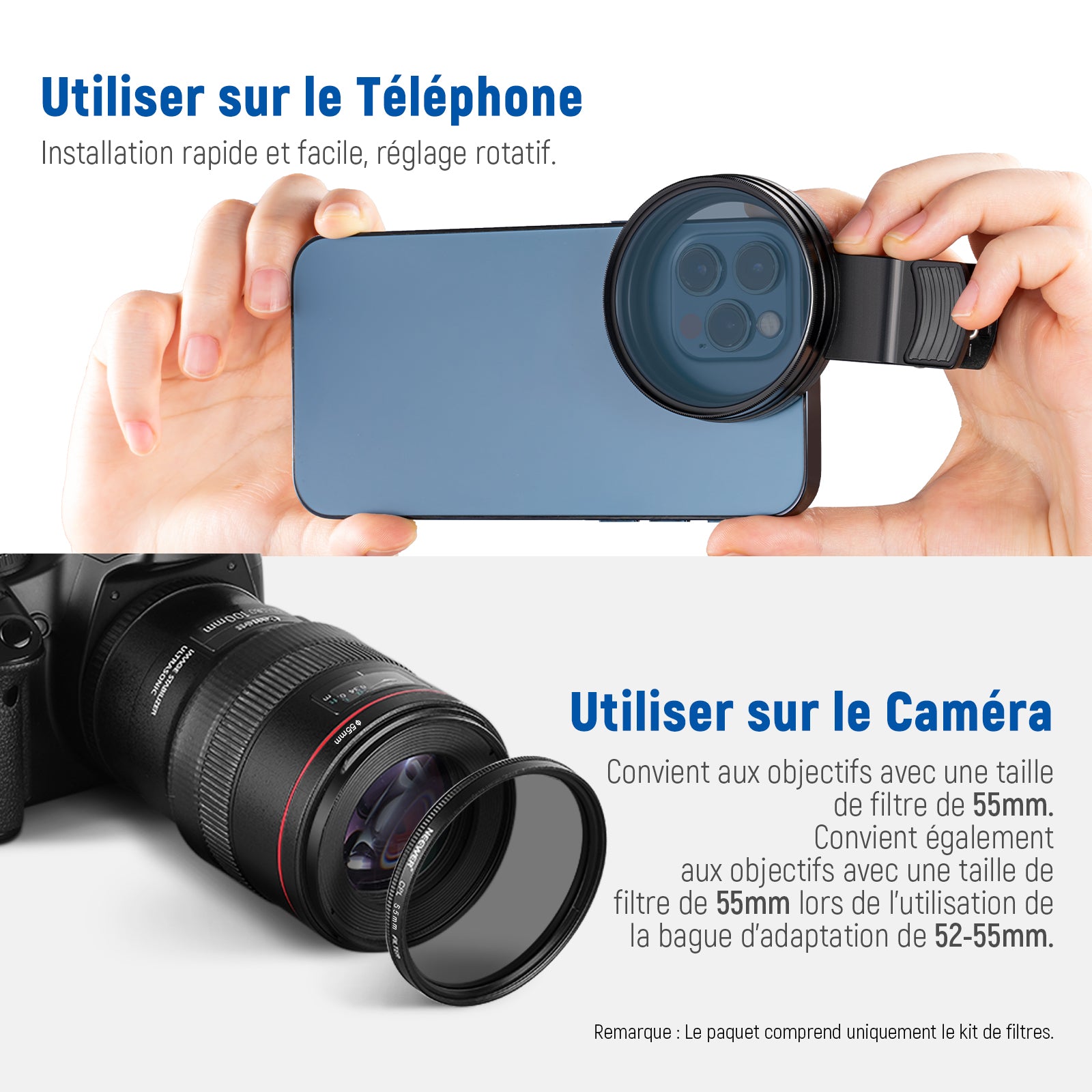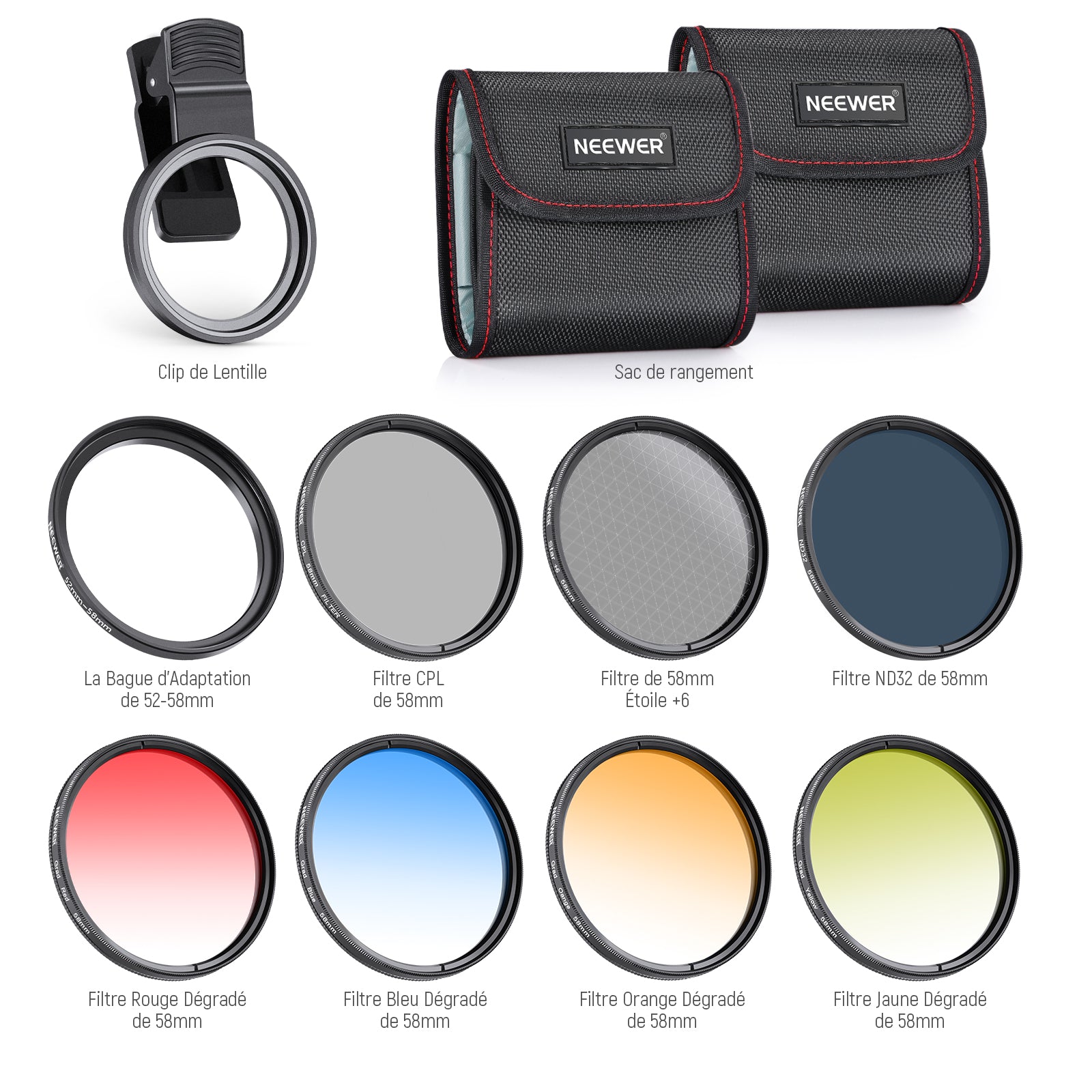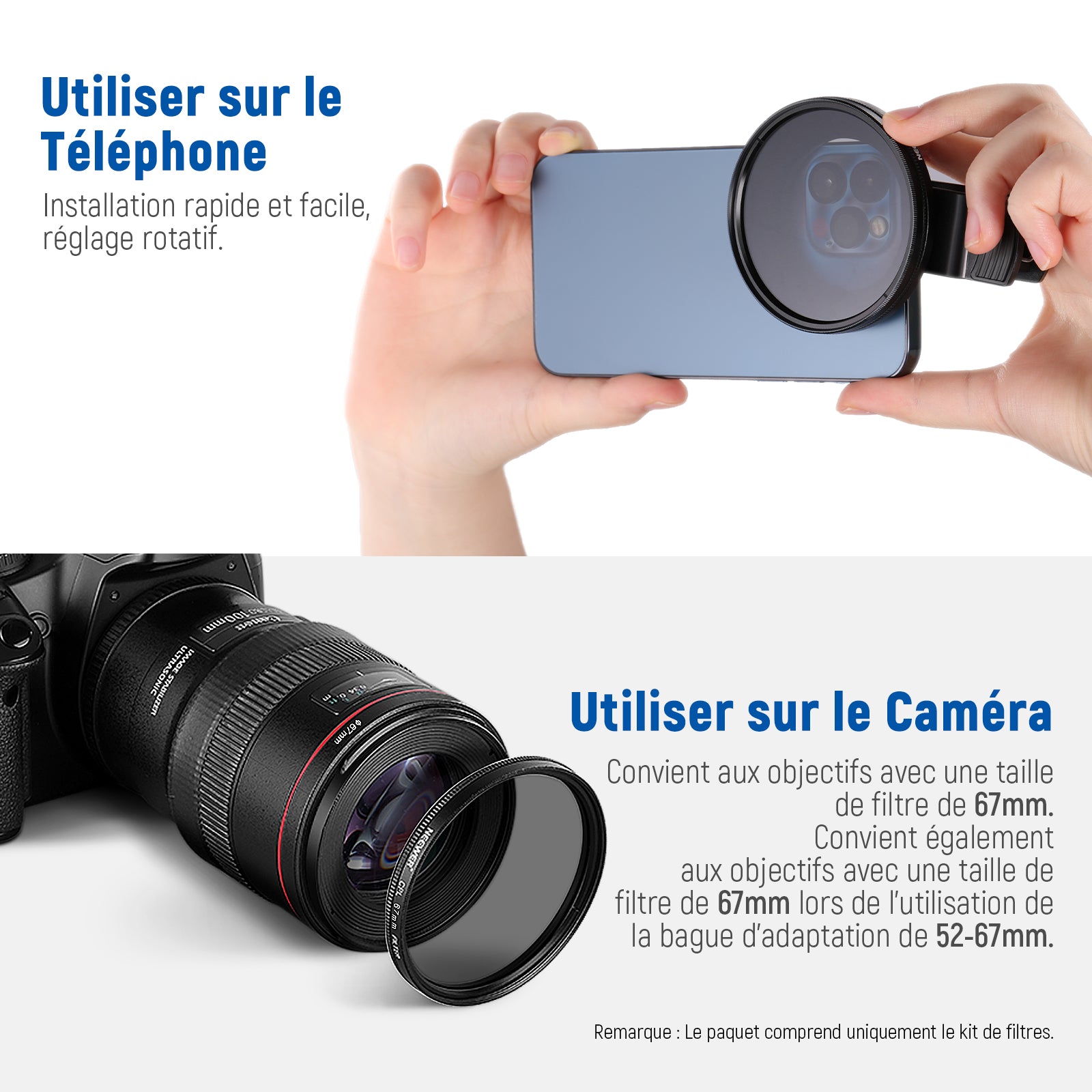 • 【Kit de filtres d'objectif】 Ce kit comprend quatre filtres de couleur gradués de 52mm (rouge, orange, jaune et bleu), 1 filtre CPL de 52mm, 1 filtre ND32 de 52mm, 1 filtre étoile à 6 points de 52mm et 1 clip d'objectif. Le cadre en aluminium du clip assure une installation sécurisée du filtre. Nous vous recommandons de ne pas utiliser de coque de téléphone mobile pour éviter les fuites de lumière