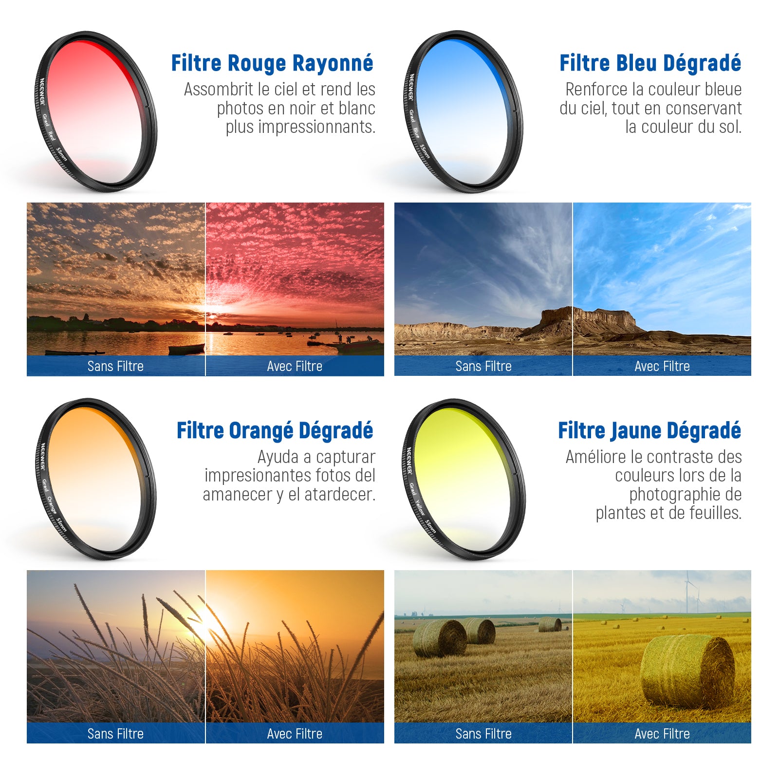 • 【Filtres de couleur gradués】 Les quatre filtres de couleur sont en résine et à double filetage, vous pouvez donc empiler des filtres, ce qui signifie que vous pouvez ajouter une couleur à une partie de l'image sans changer la couleur de l'autre partie. Ils peuvent aider à changer l'ambiance de vos photos - idéal pour la photographie de paysage et la photographie de lever et de coucher du soleil