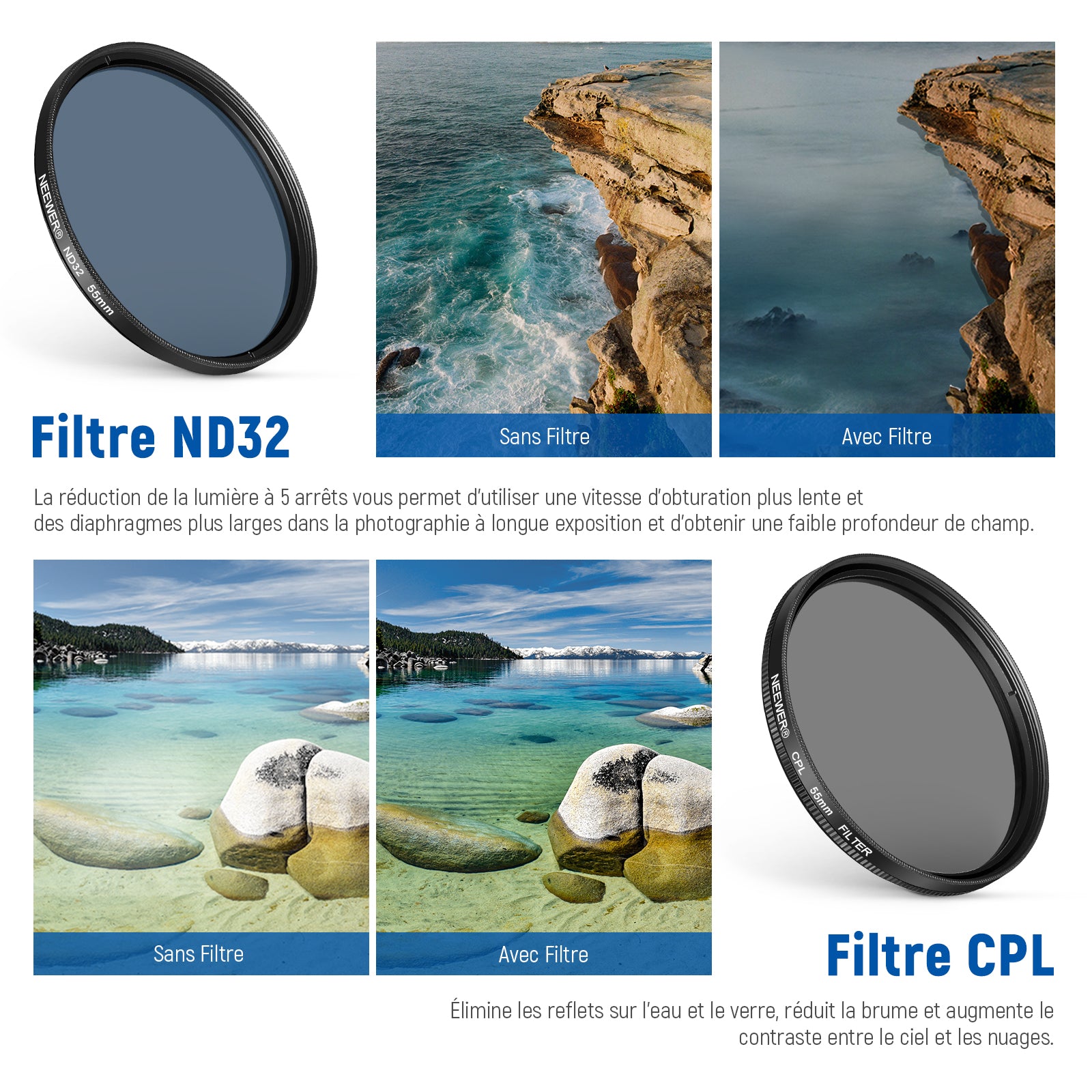 • 【Filtre à densité neutre】 Le filtre ND réduit la quantité de lumière qui pénètre dans le capteur de l'appareil photo sans en modifier la couleur. Il vous permet d'utiliser une vitesse d'obturation plus lente pour des photos créatives ou une ouverture plus grande pour une profondeur de champ plus faible. Le filtre ND32 inclus réduit de 5 stops la lumière