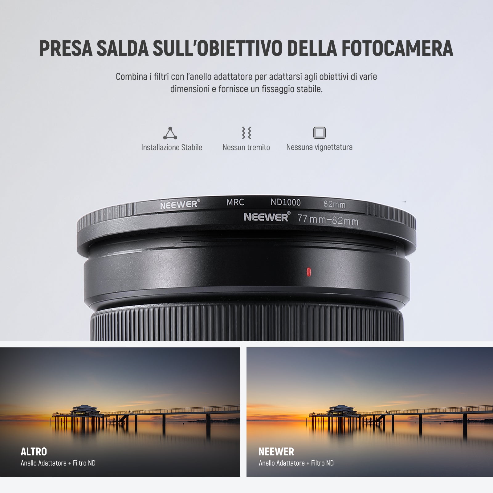 - Application : fournit un moyen de placer des filtres ou des accessoires de plus grand diamètre sur une lentille plus petite. Vous n'avez pas besoin d'acheter d'autres filtres lorsque vous avez des lentilles différentes.
