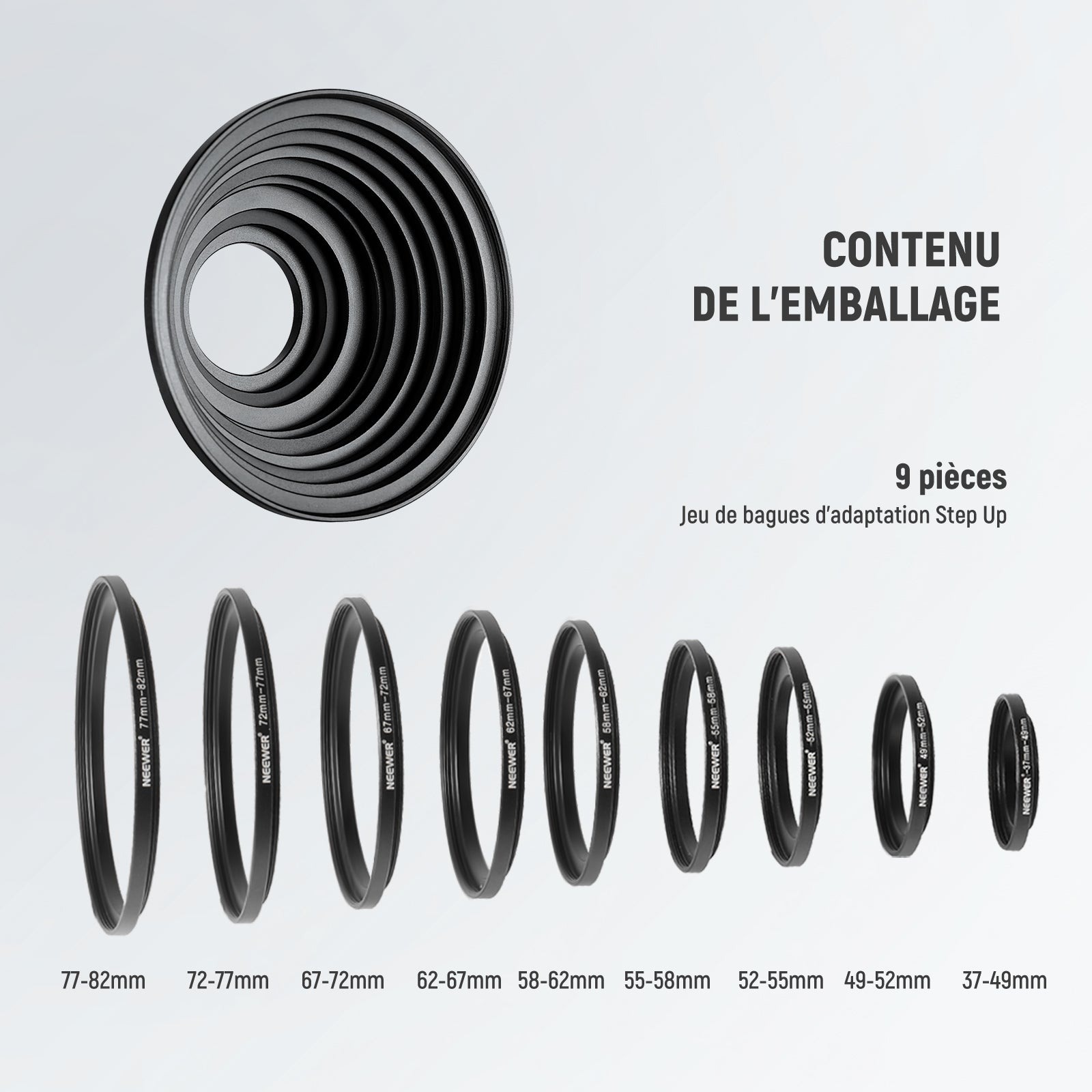 - Le kit comprend : 9 anneaux de grossissement avec adaptateur : (1) 37-49 mm, (1) 49-52 mm, (1) 52-55 mm, (1) 55-58 mm, (1) 58-62 mm, (1) 62-67 mm, (1) 67-72 mm, (1) 77 - 82 mm