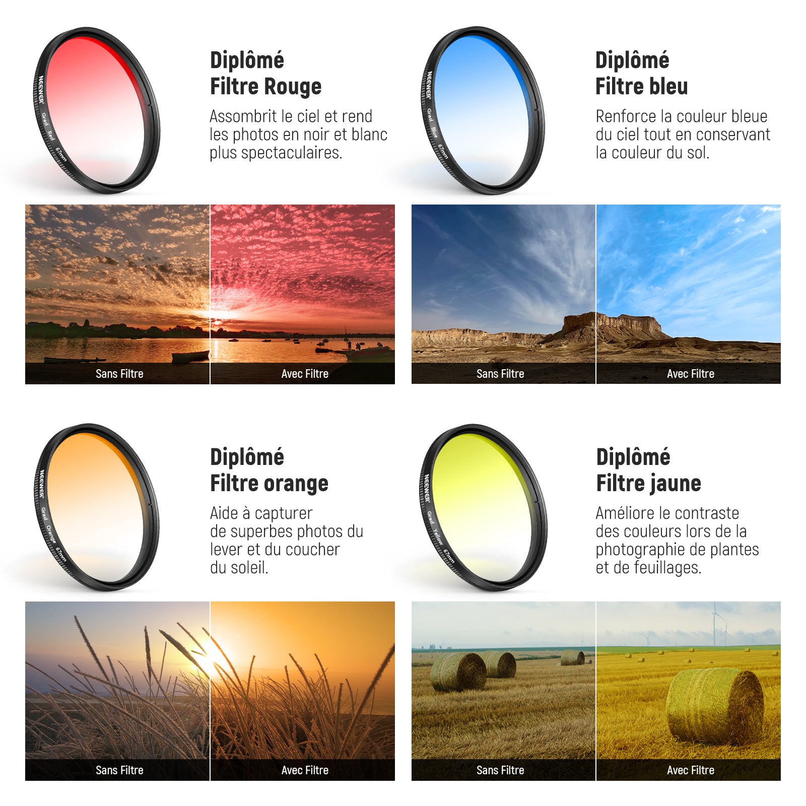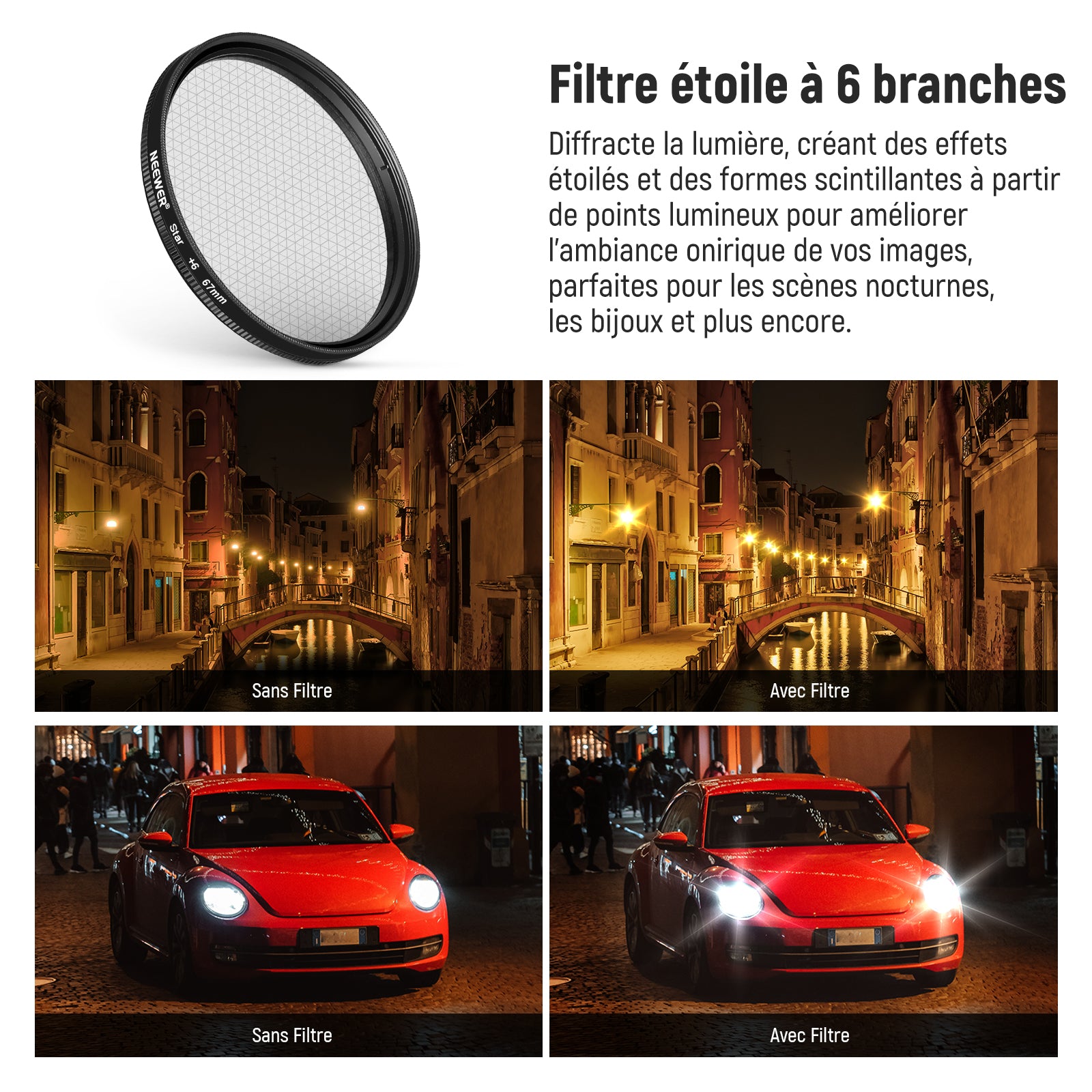 - 【Filtres de couleur gradués et effets d'étoiles éblouissants】les quatre filtres de couleur gradués en résine (rouge/orange/jaune/bleu) sont à double filetage, permettant l'empilage de filtres pour des réglages précis des couleurs. Le filtre étoile 6+ diffracte la lumière, créant des effets étoilés et des formes scintillantes à partir de points lumineux pour améliorer l'ambiance onirique de vos images, parfait pour les scènes de nuit, les bijoux et bien plus encore.