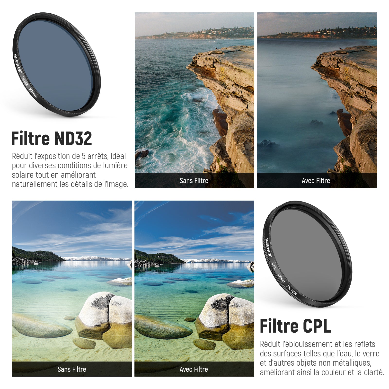 - 【Exposition équilibrée et reproduction des couleurs vives】Le filtre à densité neutre ND32 réduit l'exposition de 5 arrêts, idéal pour diverses conditions de lumière solaire tout en améliorant naturellement les détails de l'image. Le filtre polarisant circulaire réduit l'éblouissement et les reflets des surfaces telles que l'eau, le verre et d'autres objets non métalliques, améliorant ainsi la couleur et la clarté pour des photos ou des vidéos plus nettes et accrocheuses.