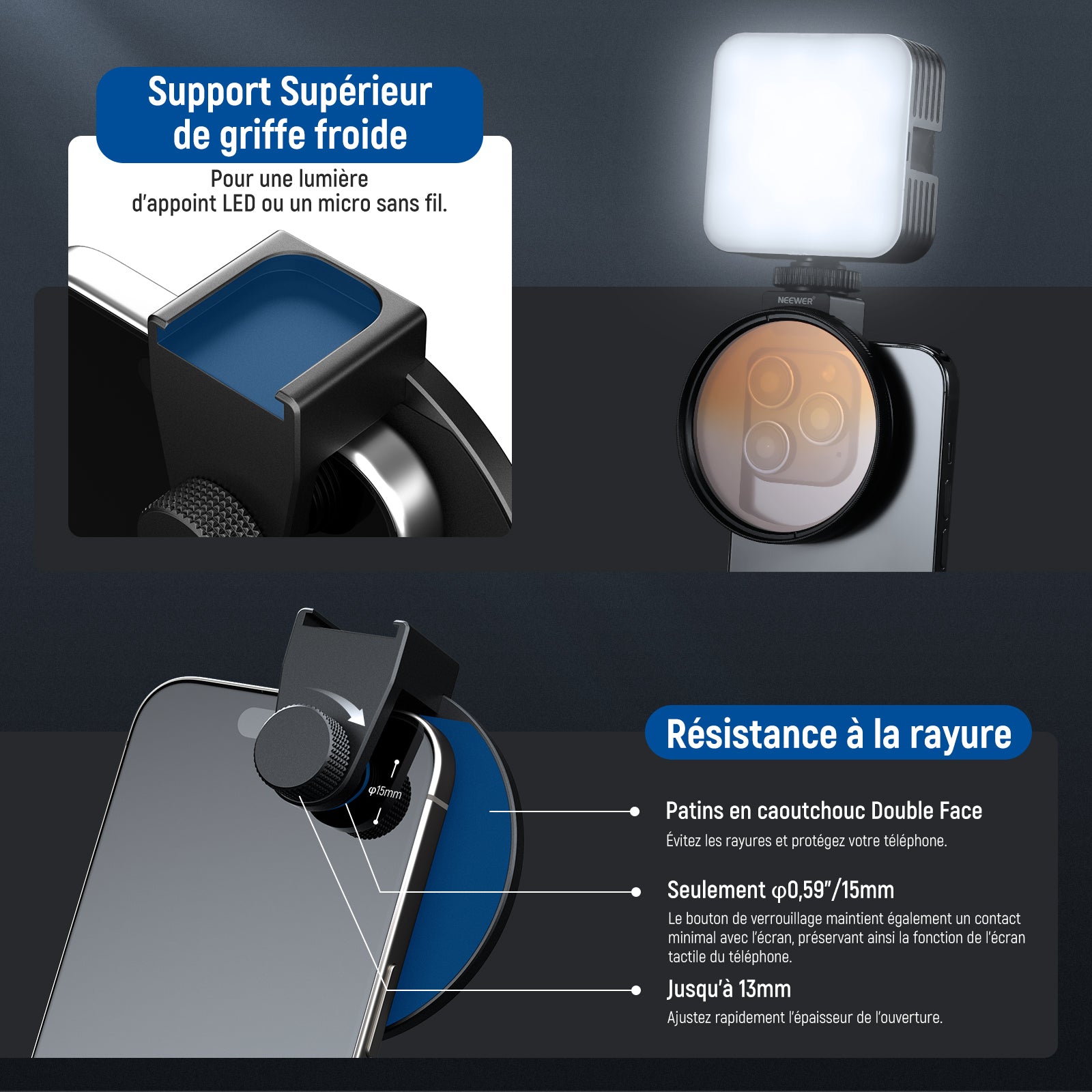 - 【Clip de filtre d'objectif de téléphone Amélioré】Améliorez votre photographie avec notre nouveau clip de filtre d'objectif. Il dispose d'un support supérieur pour une lumière d'appoint LED ou d'un micro sans fil(non inclus) et de bords incurvés pour un ajustement parfait. Les coussinets en caoutchouc double face assurent la sécurité du téléphone. Le bouton de verrouillage maintient également un contact minimal avec l'écran, préservant ainsi la fonctionnalité de l'écran tactile du téléphone.
