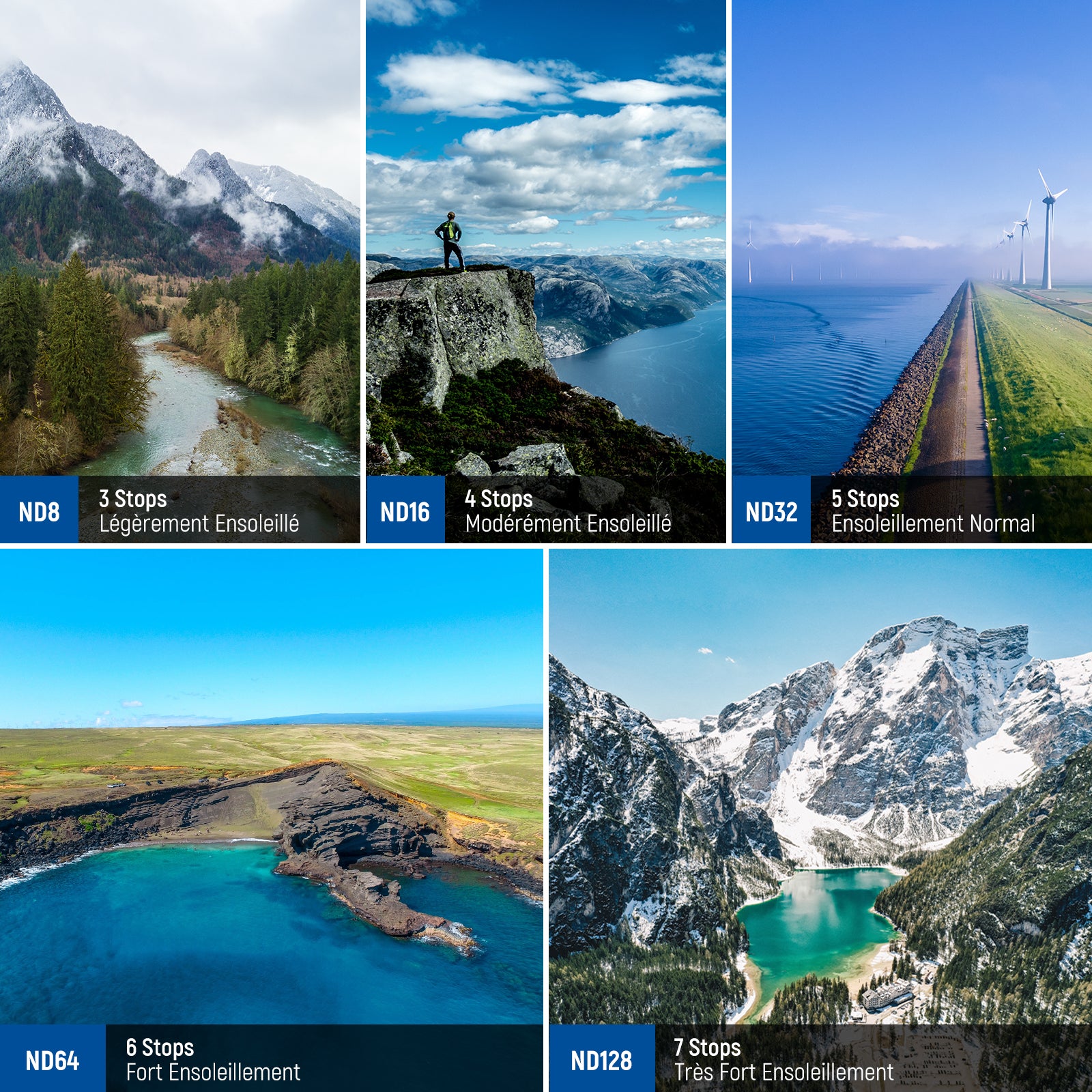- 【Exposition Équilibrée pour des Prises de Vue Aériennes Étonnantes】 Les filtres ND8, ND16, ND32, ND64 et ND128 pour l'objectif de votre drone permettent un contrôle précis de l'exposition, avec une réduction de la lumière de respectivement 3, 4, 5, 6 et 7 stops. Ils empêchent efficacement la surexposition et améliorent la qualité de l'image quelles que soient les conditions d'ensoleillement, obtenez un flou de mouvement époustouflant pour des séquences spectaculaires à chaque vol.