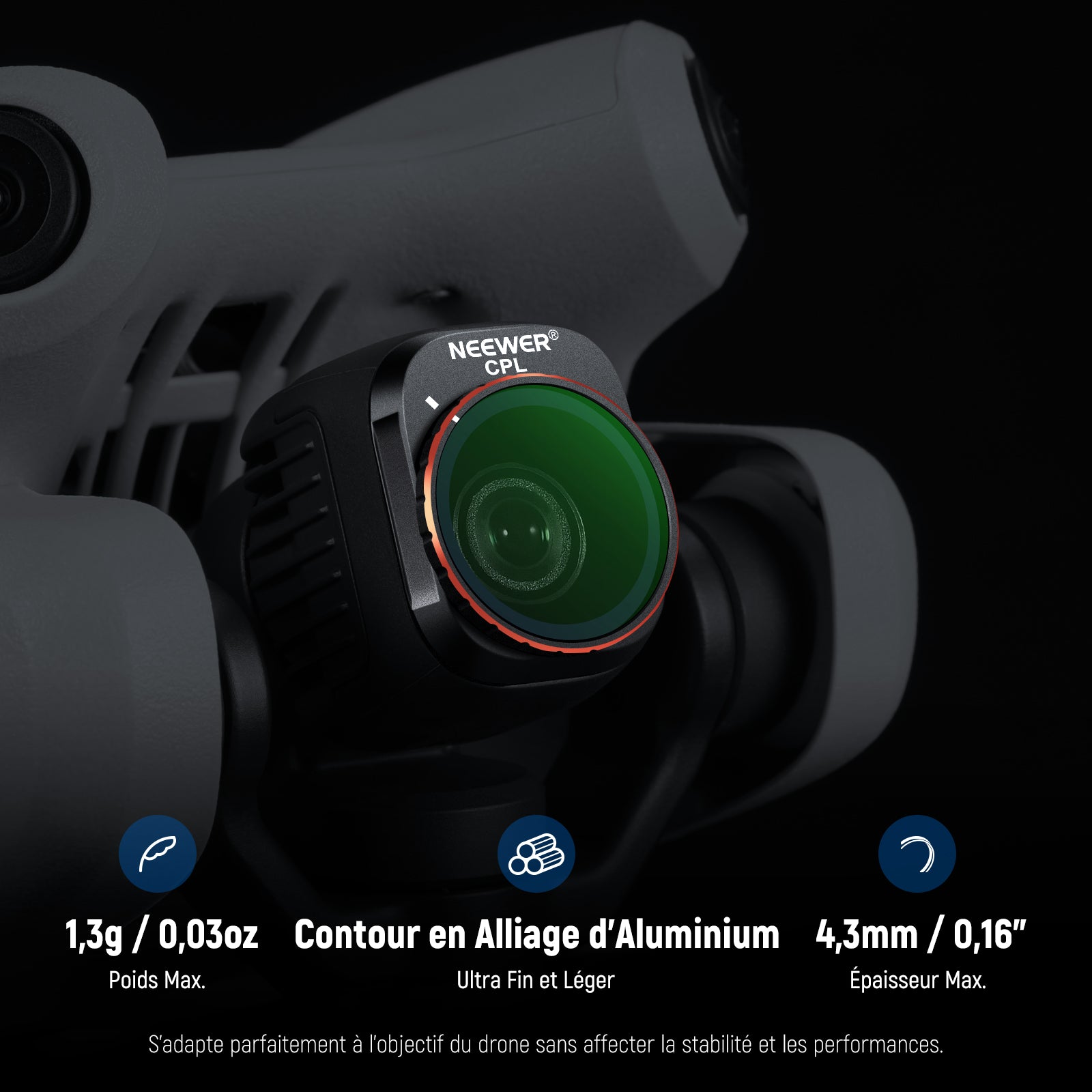 - 【Verre Optique à Revêtements Multiples & Contour Ajusté】Avec un revêtement à plusieurs couches des deux côtés du verre optique HD, ces filtres d'objectif de drone résistent à l'eau, aux rayures et à la graisse pour une qualité optique durable en milieu hostile. Le contour ultra-mince usiné avec précision s'adapte parfaitement à l'objectif du drone, il offre une bonne accroche lors des vols en flèche, des piqués, des tonneaux, des flips ou autres acrobaties, sans aucun impact sur l'équilibrage.