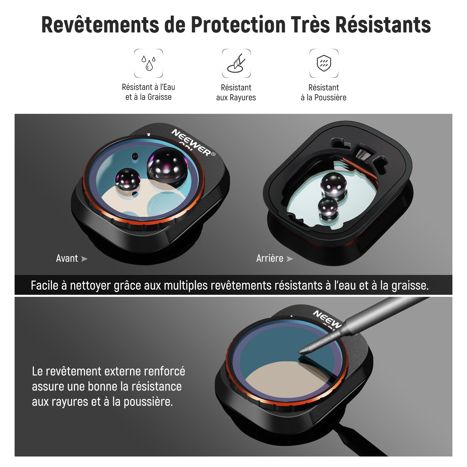 - 【Clipsage & Changement Rapides】 Le système de montage à clipser, qui ne nécessite aucun outil, permet de monter et de changer de filtre facilement et rapidement. Le kit de filtres est livré avec un étui de rangement compact et un chiffon de nettoyage pour faciliter le transport et l'entretien.