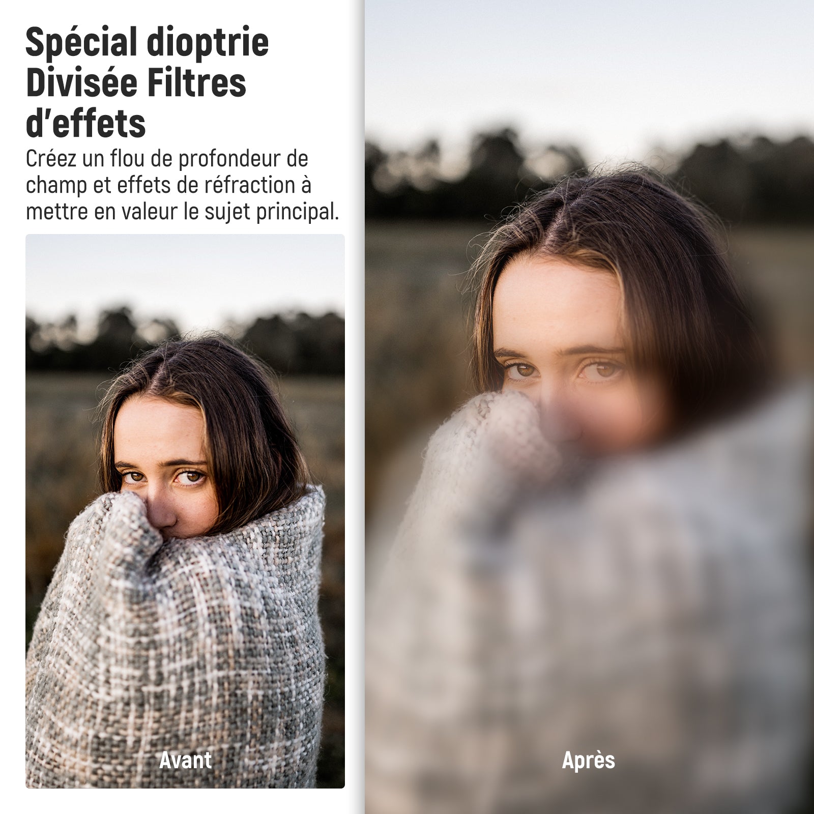 - 【Utilisations Polyvalentes】Ce filtre à effets spéciaux apporte des astuces plus inattendues, idéal pour les portraits créatifs, la publicité, le paysage, l'architecture, le commerce, la photographie d'art et plus encore.