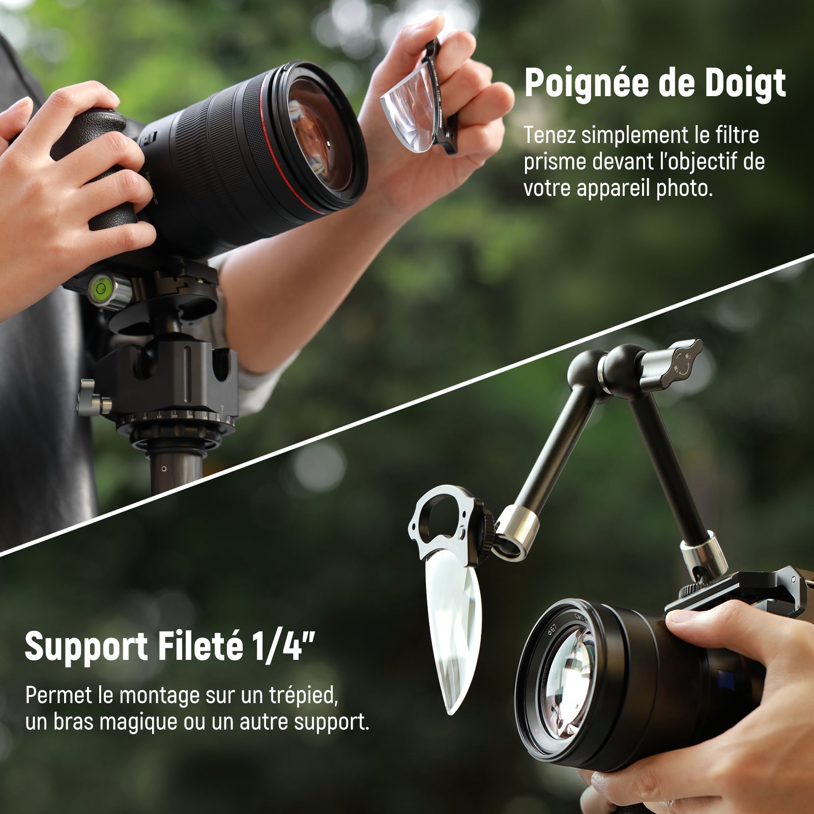 - 【Utilisation Portable ou Montée sur trépied】tenez simplement ce filtre à prisme à effet devant l'objectif de votre appareil photo avec la poignée intégrée, ou montez-le via un trou fileté de 1/4" sur un petit trépied, une perche à selfie ou un bras magique flexible pour des effets plus captivants