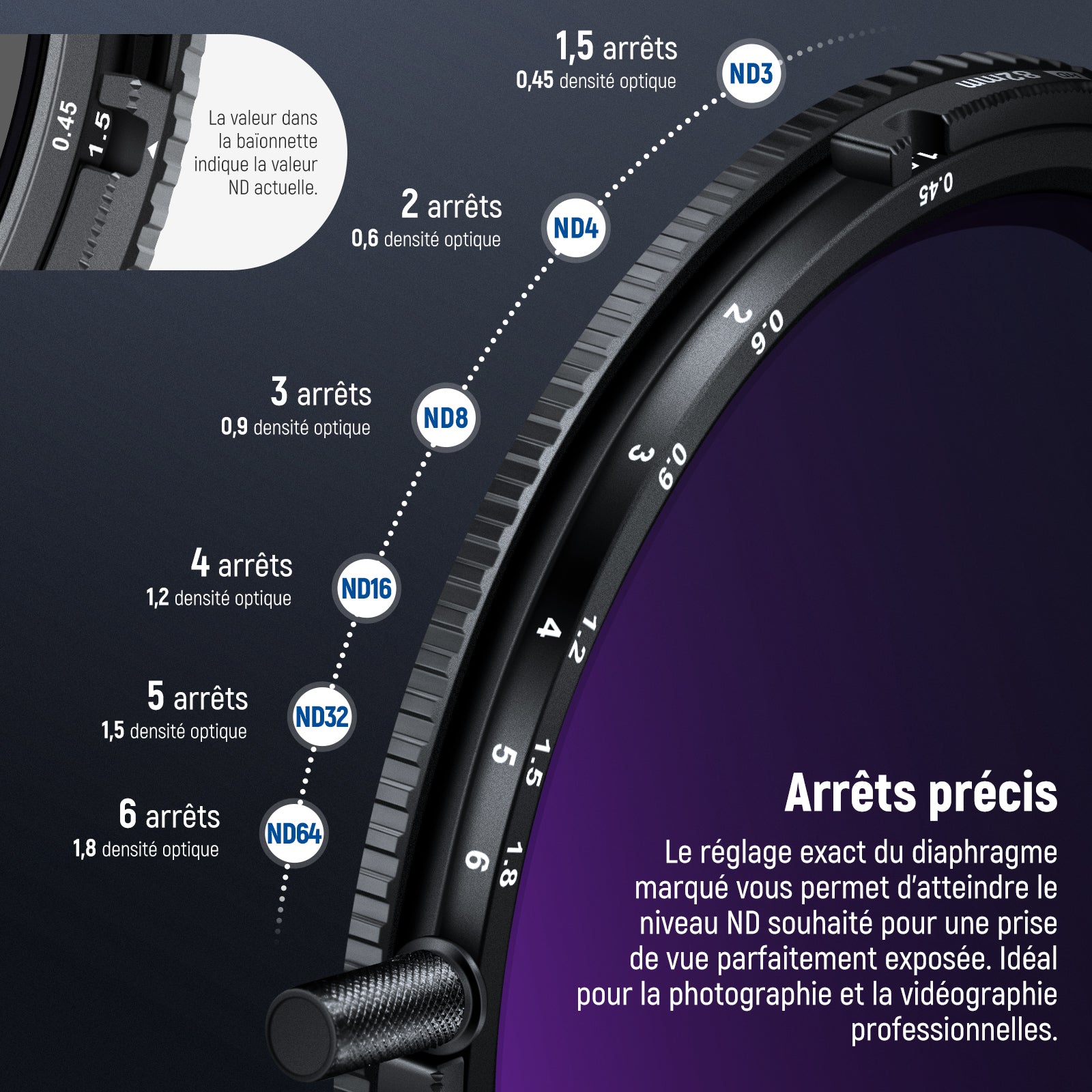 - 【Contrôle précis d'exposition avec filtre ND variable】 Ce filtre d'objectif de caméra variable limité permet un réglage d'exposition en desserrant bouton manuel et en tournant filtre pour régler de ND2,ND4,ND8,ND16 à ND32 (1 à 5 arrêts) pour un contrôle précis d'exposition.Quantité de lumière qui pénètre dans capteur de caméra.Remarque:Utilisation de l'ouverture maximale peut provoquer une croix noire X en raison de l'interaction du filtre ND variable avec certains objectifs et distances focales