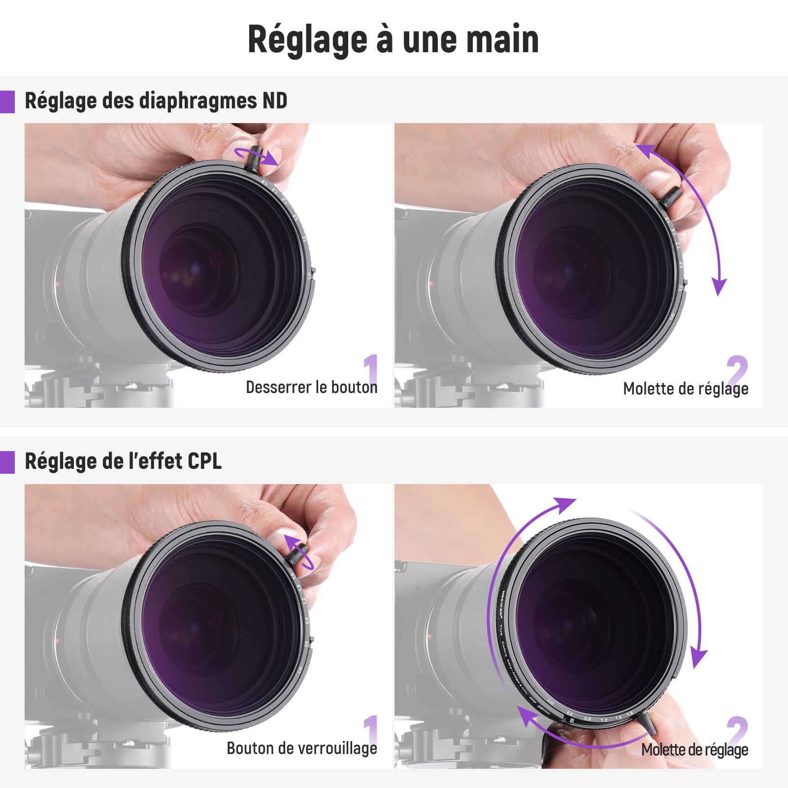 - 【Contraste amélioré et sans réflexion】 Ajustez d'une seule main. Verrouillez le bouton manuel et faites pivoter le filtre pour passer au filtre polarisant. Vous pouvez ajuster l'arrêt ND souhaité et réduire l'éblouissement et la réflexion de l'eau, du verre, du feuillage et d'autres surfaces non métalliques. Faites pivoter pour obtenir un contrôle précis pour des images claires avec plus de détails et une saturation accrue