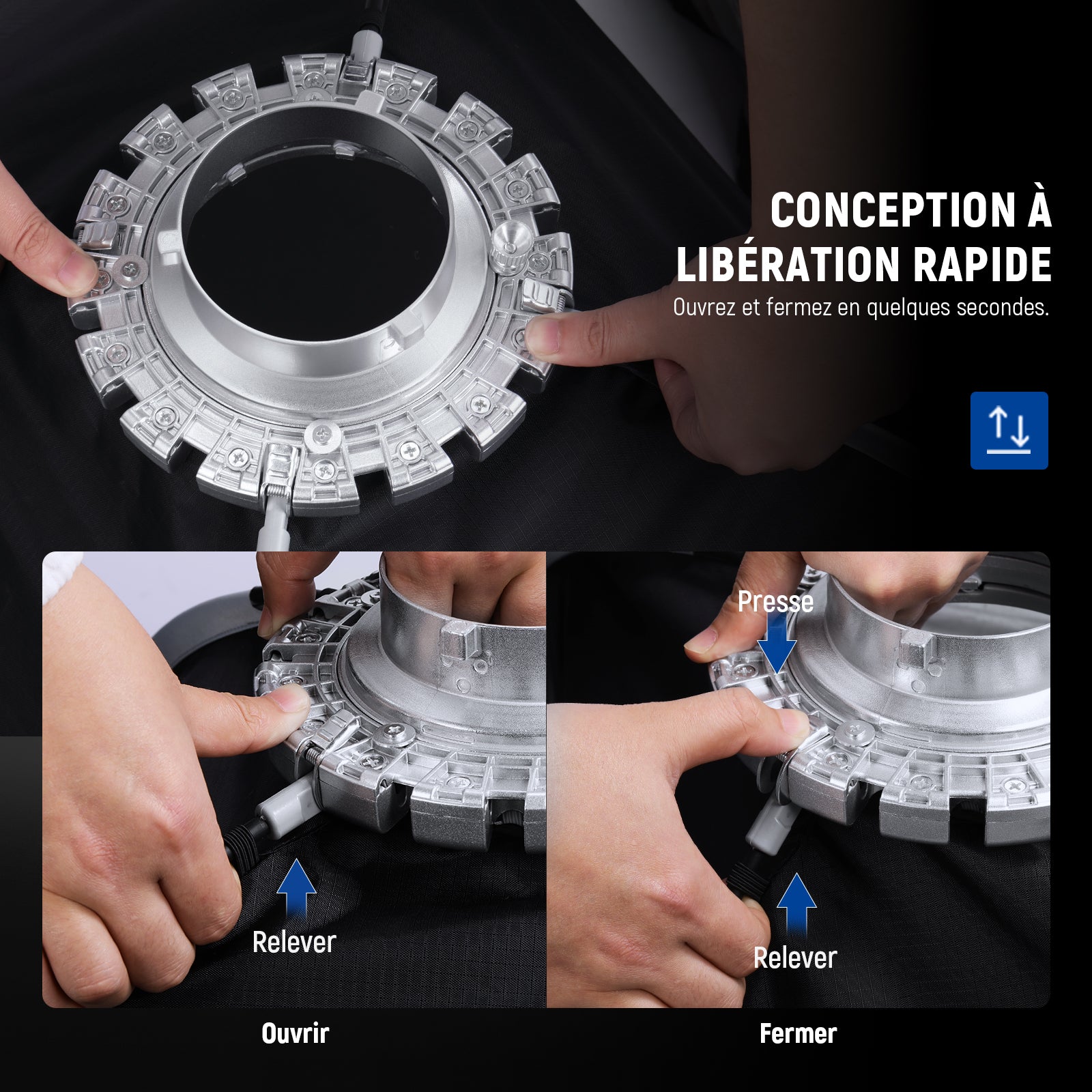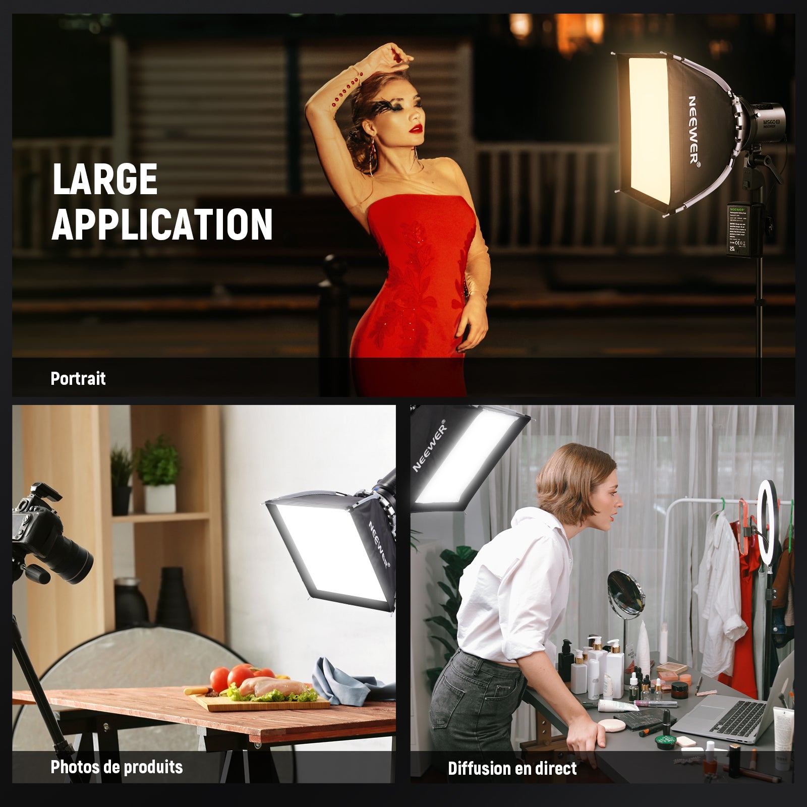 - 【Fixez via le support Bowens】 Ce diffuseur de boîte à lumière de photographie avec support Bowens standard est compatible avec divers équipements d'éclairage de studio, flashs stroboscopiques, flashs monolights et lumières vidéo LED COB à sortie continue, y compris NEEWER Vision 4 Q4 CB300B CB200B FS150B CB100C MS150B MS60C MS60B CB60 RGB S101. -300W/400W PRO, compatible avec Aputure 300c 200X 60D 60x S, compatible avec Godox SL60w, compatible avec SmallRig RC 120D RC 120B, etc.