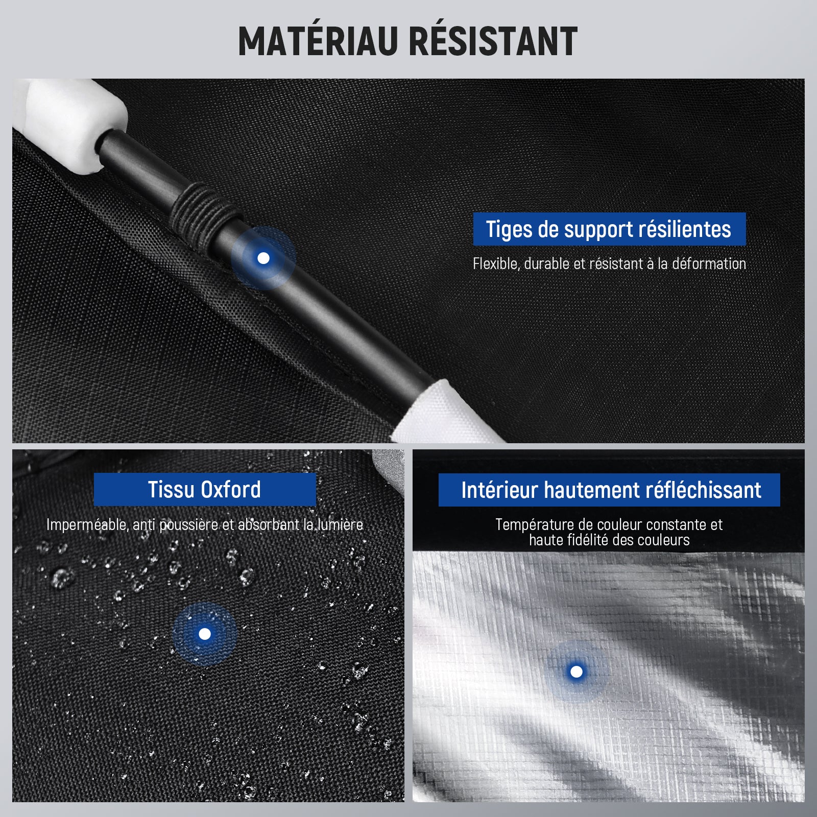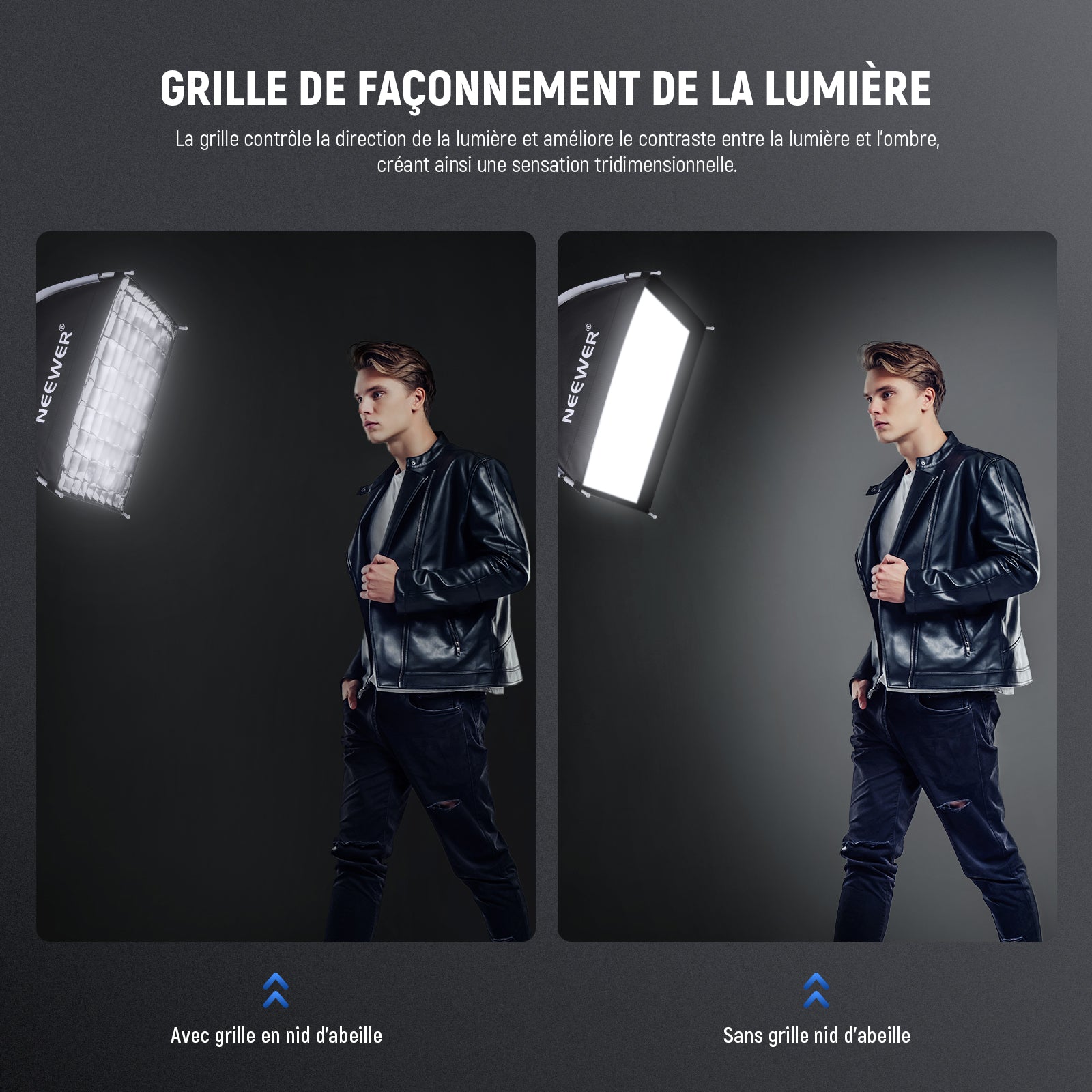 - 【Grille et diffuseurs en nid d'abeille personnalisables】 Pour divers scénarios de prise de vue et styles de photographie – qu'il s'agisse de portrait, de nature morte ou de diffusion en direct, une grille en nid d'abeille rend l'éclairage plus confiné et directionnel, et deux panneaux de diffusion fixés via des attaches tactiles peuvent atténuer l'éblouissement et éliminer les ombres.
