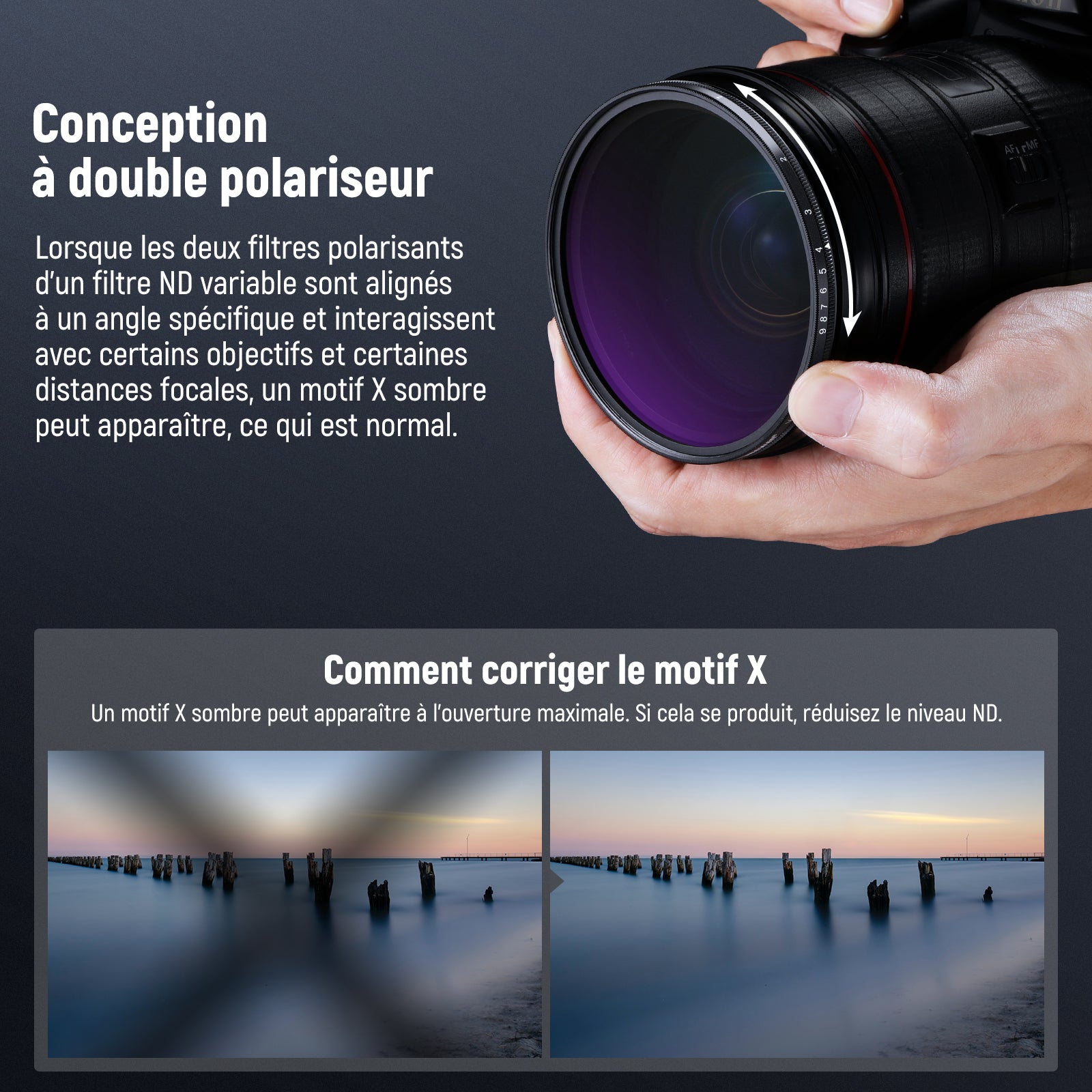 - 【Contrôle d'exposition flexible】 Ce filtre ND2-400 variable offre une réduction de lumière limitée de 1 à 9 arrêts. Faites-le pivoter pour obtenir des arrêts précis pour les valeurs ND souhaitées et des images parfaitement exposées. Remarque : un motif X sombre peut apparaître à l'ouverture maximale. Ce phénomène normal se produit lorsque le filtre ND variable, avec ses deux filtres polarisants alignés à un angle spécifique, interagit avec certains objectifs et distances focales