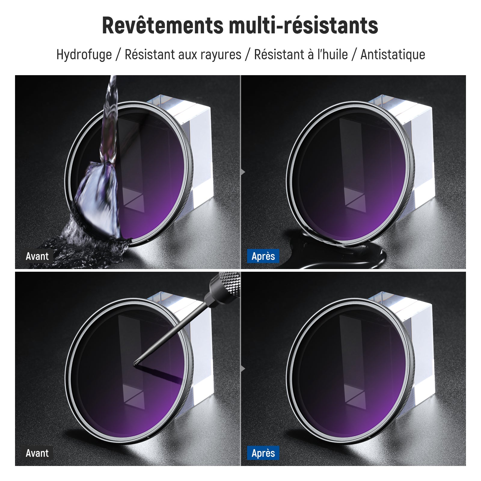 - 【Verre optique multicouche】 Le verre optique assure une grande clarté et une reproduction précise des couleurs. Les multiples revêtements des deux côtés du verre sont résistants à l'eau, aux empreintes digitales, aux taches et aux rayures, ce qui rend les filtres faciles à nettoyer (un chiffon de nettoyage est inclus)