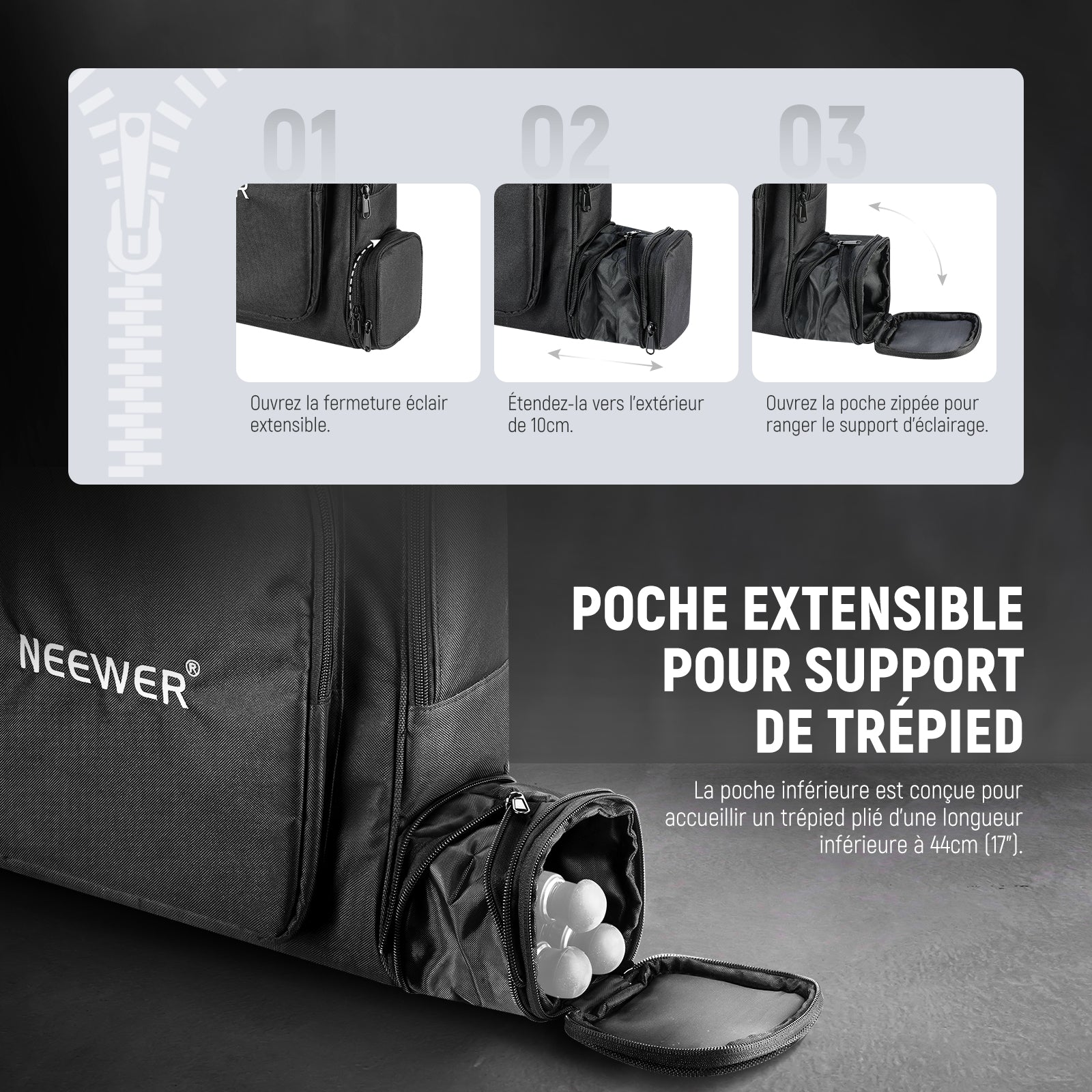 - Section séparée pour trépied plié : le bas dispose d'une zone de rangement semblable à une barre qui peut accueillir un support d'éclairage plié jusqu'à 44 cm. Un séparateur rembourré maintient votre terminal satellite séparé du support métallique pour éviter les rayures et les dommages. Son entrée est conçue avec 2 fermetures éclair individuelles pour le réglage de la longueur du stockage, permettant un ajustement parfait pour les trépieds de différentes tailles