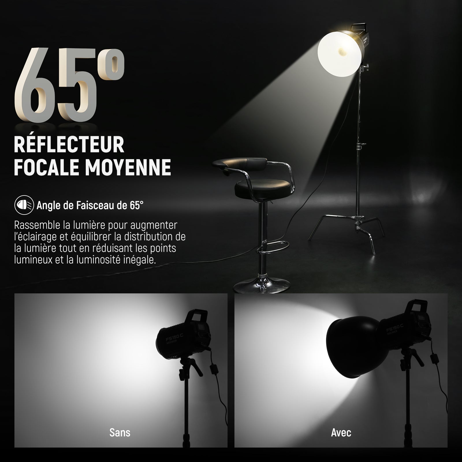 - 【Réflecteur à mise au point moyenne 65°】 Le réflecteur Bowens FR26 mesure φ10,4″x9,3″L (26,5x23,5cm) et dispose d'une mise au point moyenne, offrant un meilleur équilibre entre la concentration de la lumière et une sortie uniforme par rapport aux autres types. Il réduit efficacement les taches lumineuses et les reflets tout en minimisant la luminosité inégale, ce qui donne une lumière vive mais naturelle sur le sujet, parfaite pour obtenir des captures optimales dans la photographie commerciale.