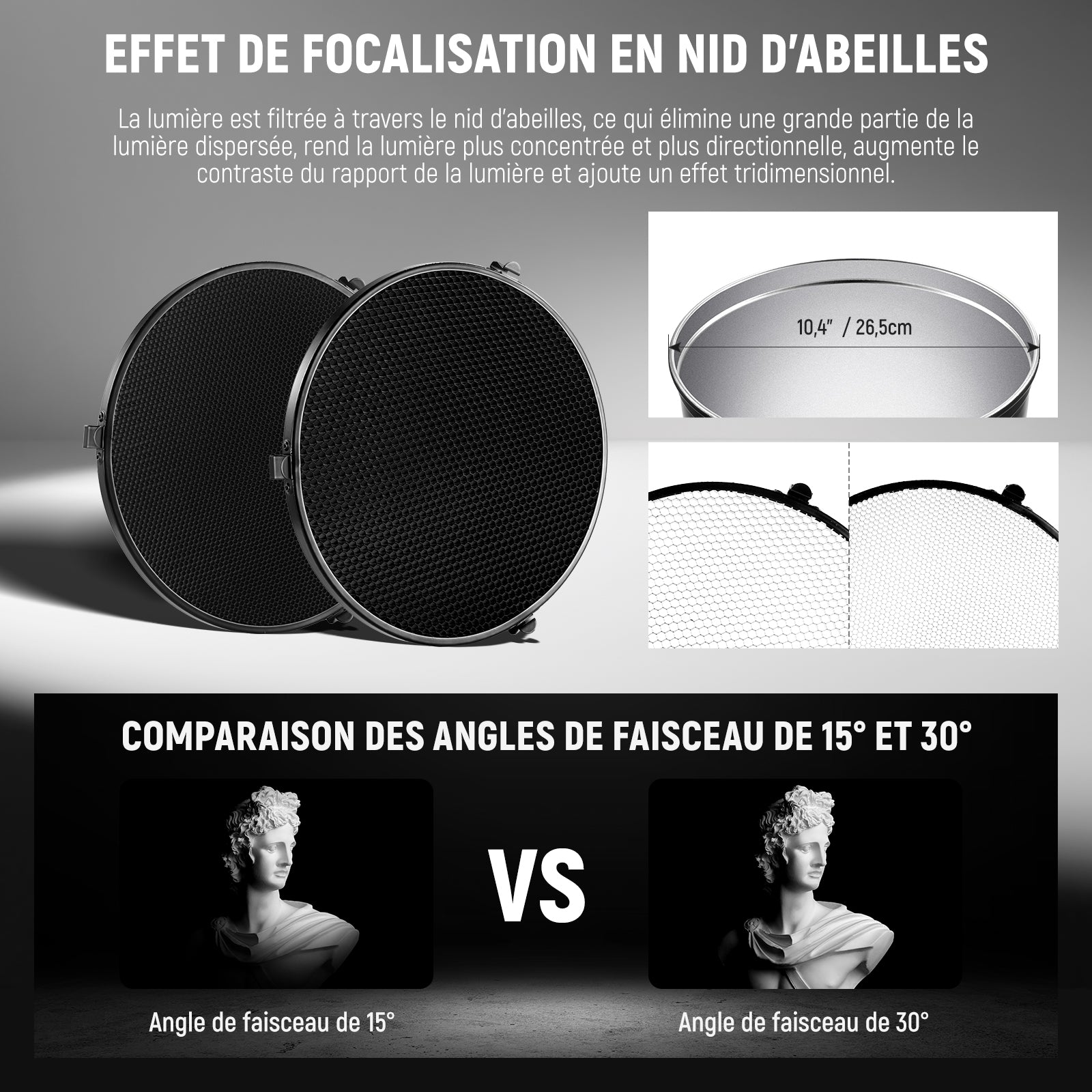 - 【Grilles en nid d'abeille 15°/30°】 Deux angles de grilles en nid d'abeille rétrécissent faisceau de l'abat-jour et fournissent différents effets d'ombre pour souligner les détails.Aide à contrôler déversement de lumière pour résultats d'éclairage souhaités en modifiant forme et l'intensité de sortie lumineuse.Ils évitent arrière-plans trop lumineux,améliorent contraste et ajoutent de la profondeur à vos prises de vue.Grilles en nid d'abeille sont faciles à monter et à remplacer en les clipsant