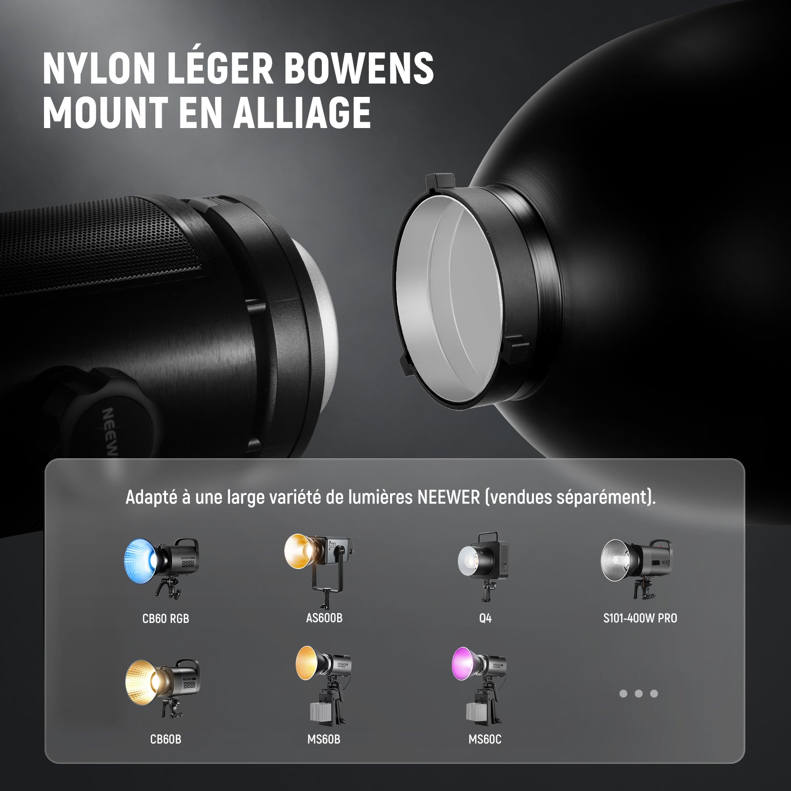 - 【Monture Bowens standard】 Le réflecteur de lumière stroboscopique NEEWER FR26 est équipé d'une monture Bowens pour fixer de manière flexible une large gamme de lumières de photographie Bowens, compatible avec Profoto compatible avec Godox compatible avec Aputure NEEWER studio stroboscopes, flashs, speedlites, monolights, supports d'adaptateur, etc. La conception de précision assure un ajustement sûr, permettant un montage facile et un retrait rapide
