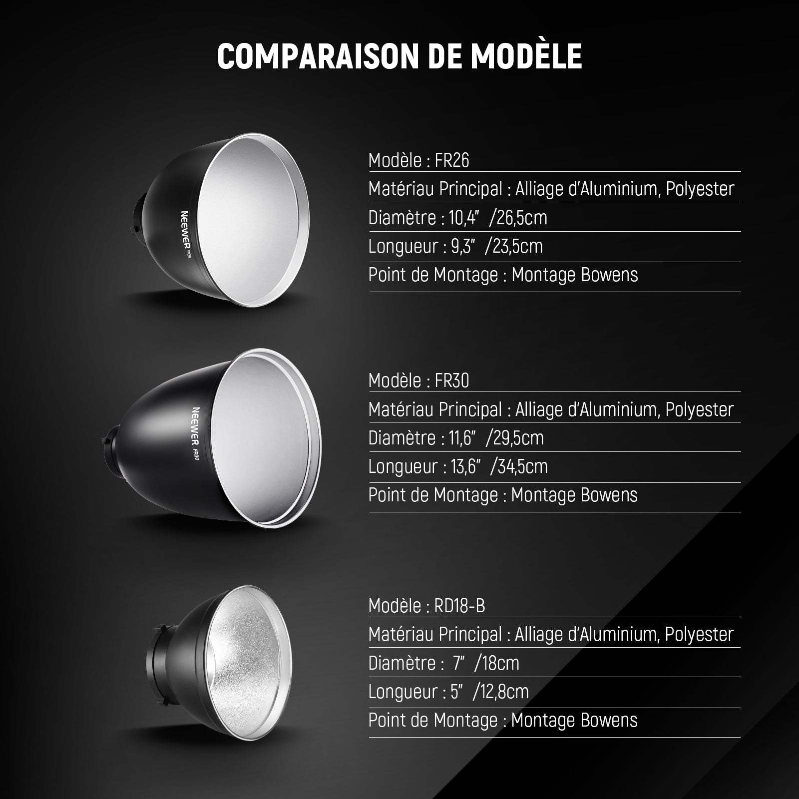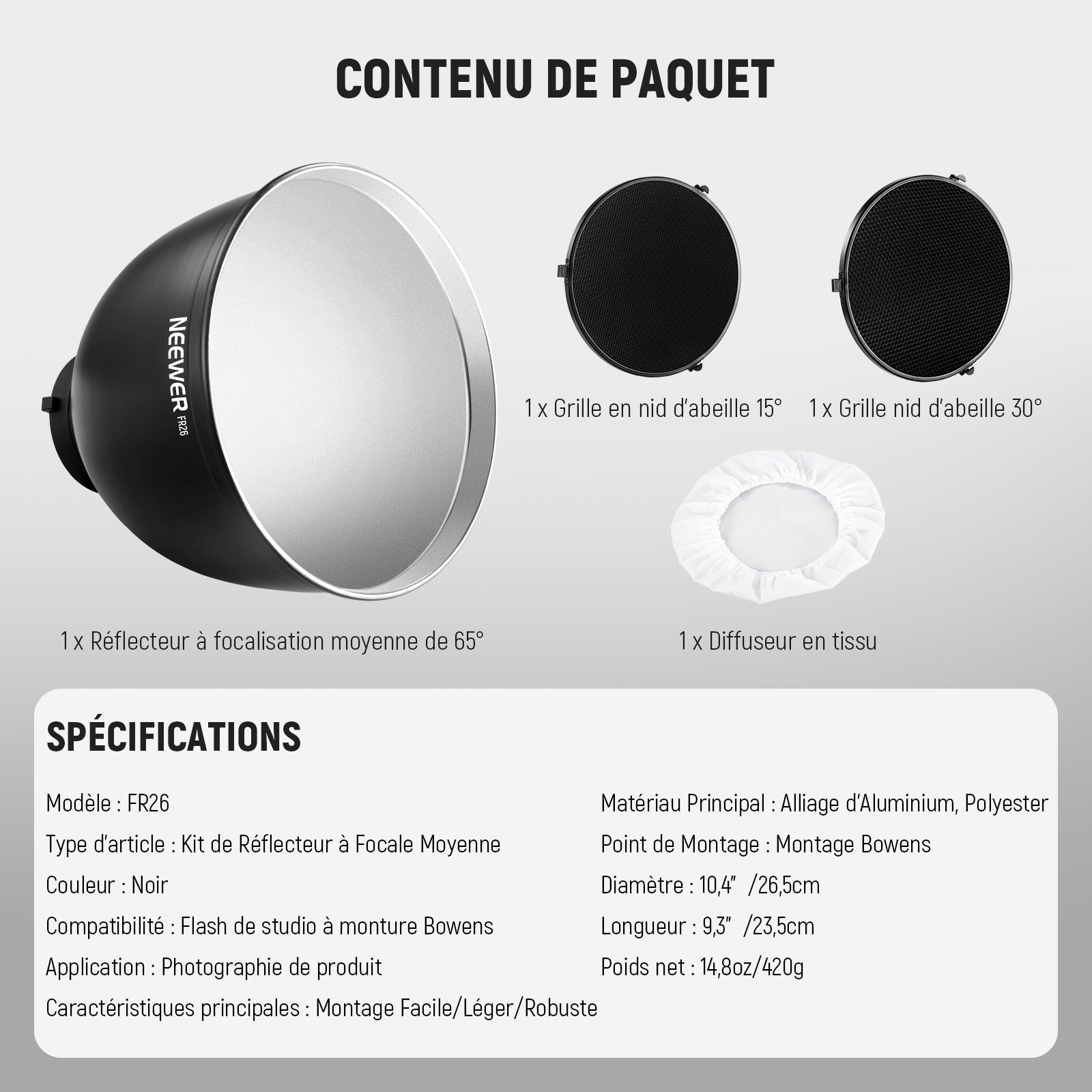 NEEWER Kit FR26 Réflecteur à Focalisation Moyenne 26,5cm Monture Bowens