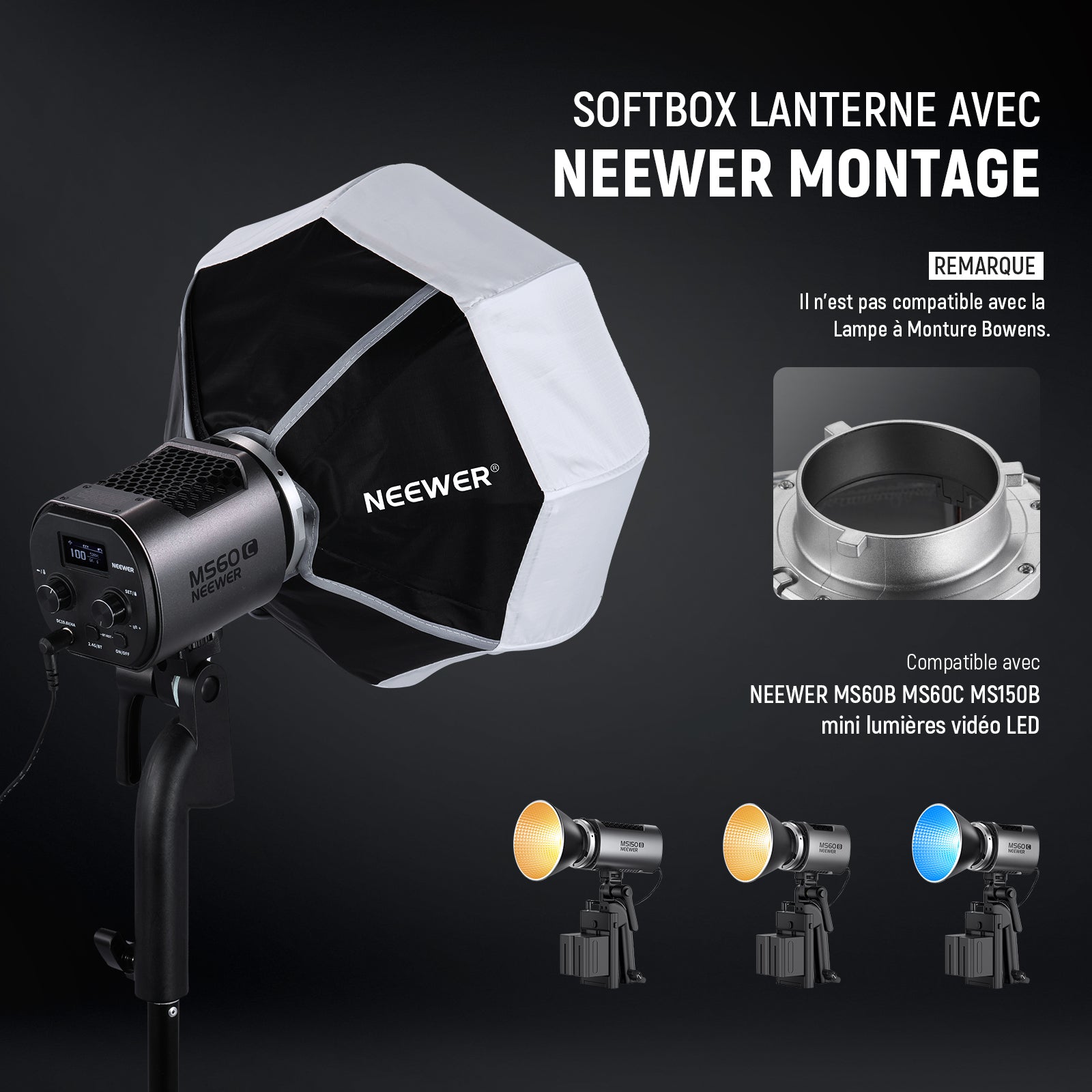 - 【Boîte à lumière pour lanterne avec support NEEWER】 Cette boîte à lumière 12"/30cm est uniquement compatible avec les mini-lampes vidéo LED NEEWER MS60 MS60B MS60C MS150B. Sa taille compacte en fait un choix idéal pour les installations d'éclairage doux en extérieur, permettant des changements rapides entre les modificateurs de lumière NEEWER et d'autres accessoires avec les adaptateurs de montage NEEWER (Note : Il n'est pas compatible avec les lampes à monture Bowens. )