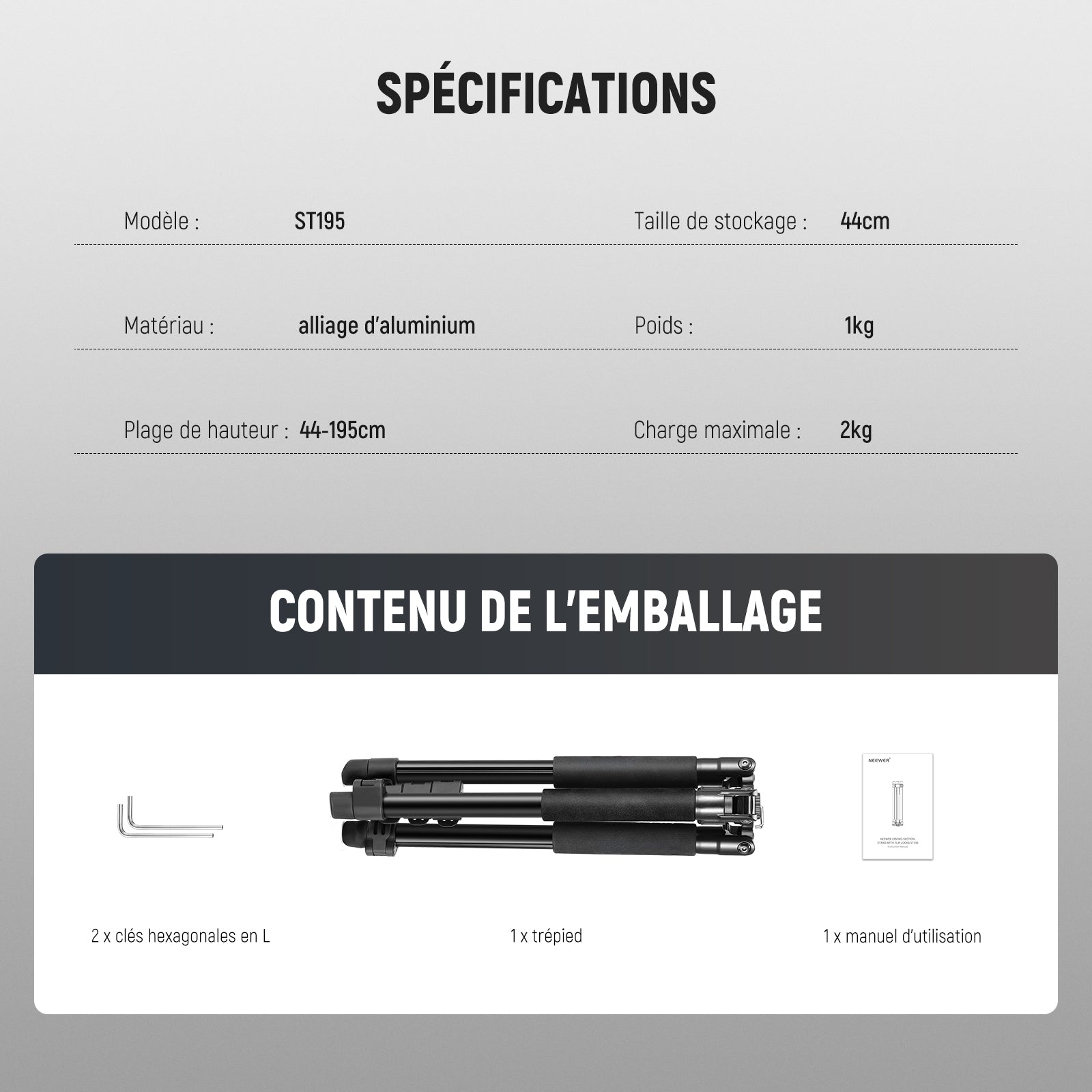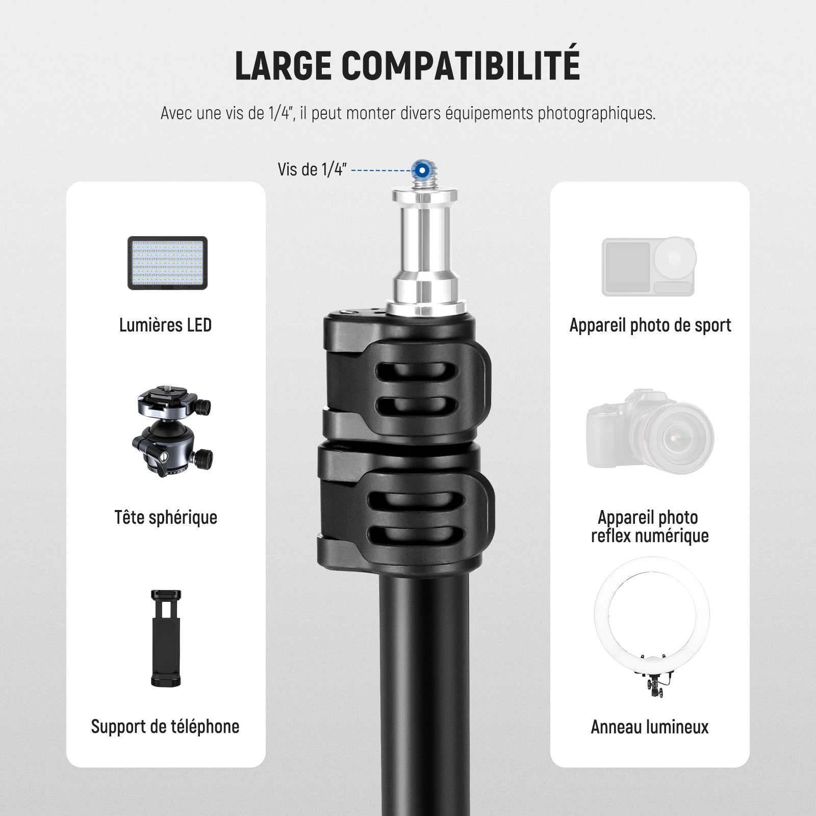 - Compatibilité polyvalente : le trépied NEEWER ST195 pour photographie dispose d'une vis de 1/4" pour fixer une variété d'appareils photo qui ne sont pas seulement des lumières stroboscopiques, comme par exemple Par exemple, lumière continue, annulaire, lampes vidéo LED, monolights, boîtes à lumière, parapluies et caméras d'action. Qu'il s'agisse de photos de produits, de portraits ou de prises de vue en plein air, avec ce trépied de lampe, vous êtes parfaitement équipé