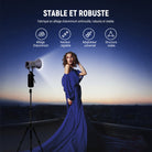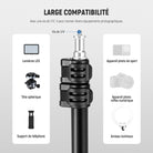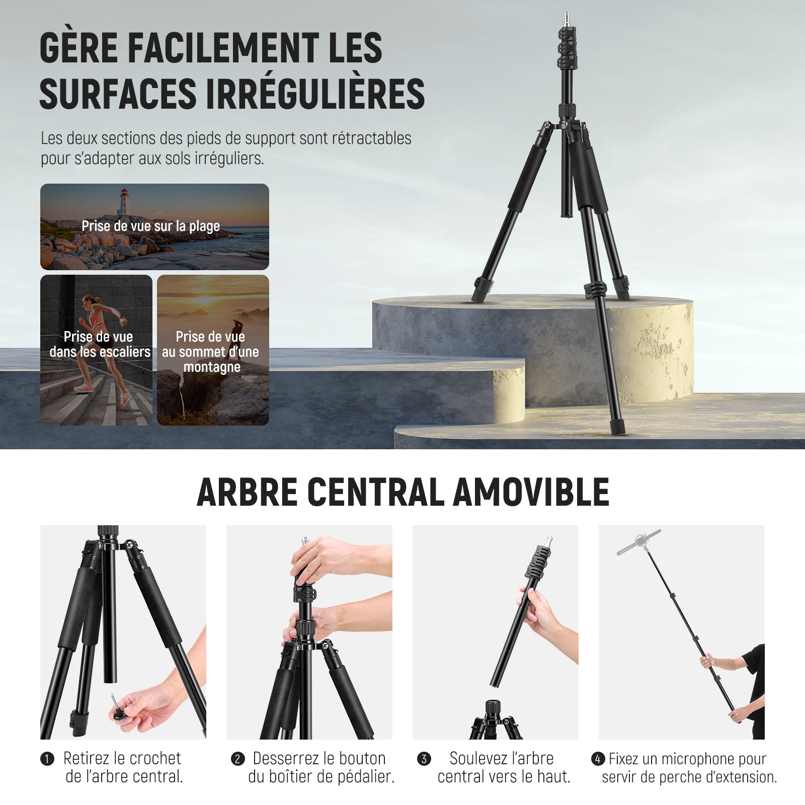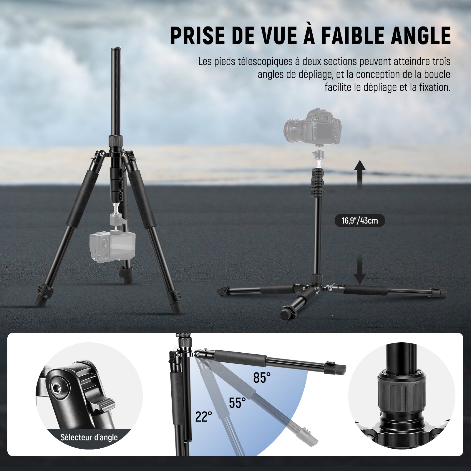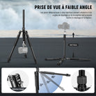 - Pied de trépied stable avec pieds réglables : les pieds télescopiques en deux parties permettent 3 angles de déploiement qui sont faciles à écarter et à sécuriser grâce à la construction Snap. Écartez les pieds jusqu'à ce que la colonne centrale touche le sol et que l'angle atteigne son maximum pour augmenter la stabilité du support