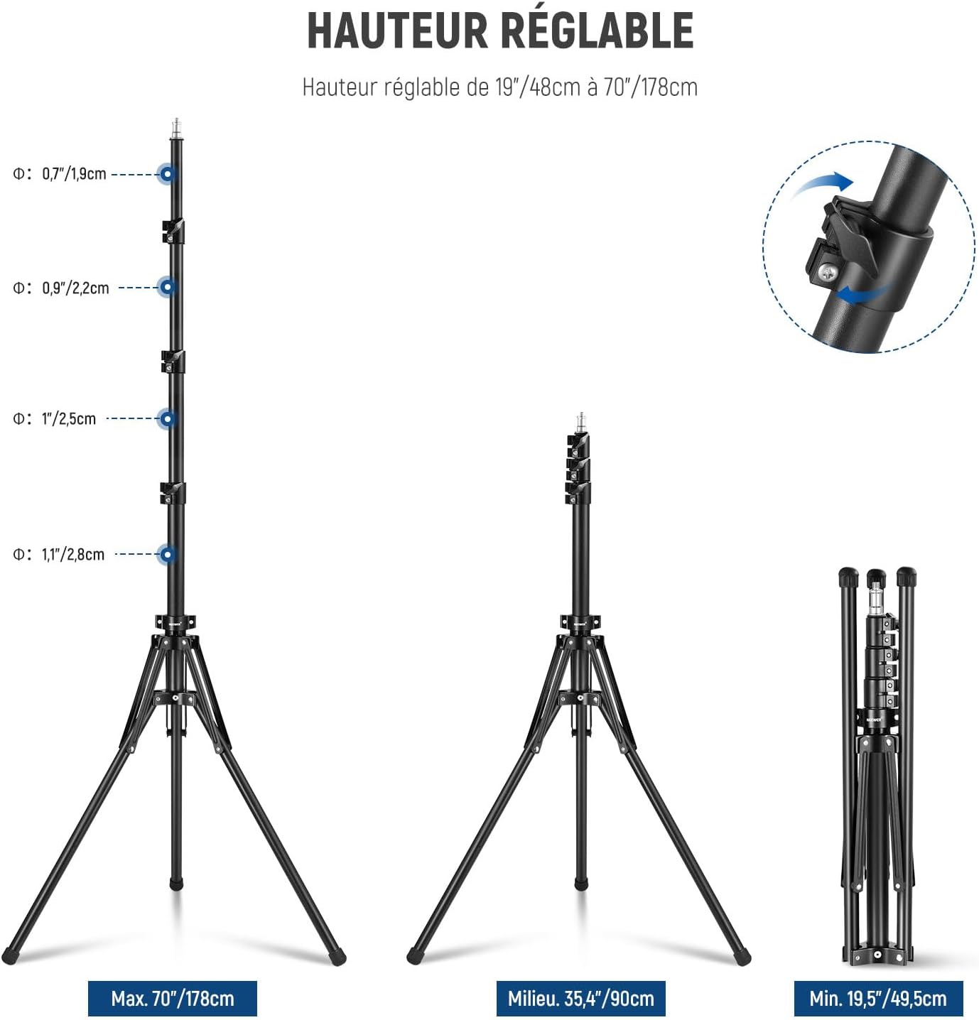 - 【Support d'éclairage de Photographie en Fer Robuste】Quatre tubes en fer renforcé présentent une épaisseur de 0,02"/0,4mm et un diamètre de 1,1"/28mm, 1"/25mm, 0,9"/22mm et 0,7"/19mm. Cette conception garantit une stabilité accrue et un capacité de charge robuste de 11lb (5kg). Les couvre-pieds en caoutchouc offrent une friction supplémentaire pour renforcer la stabilité