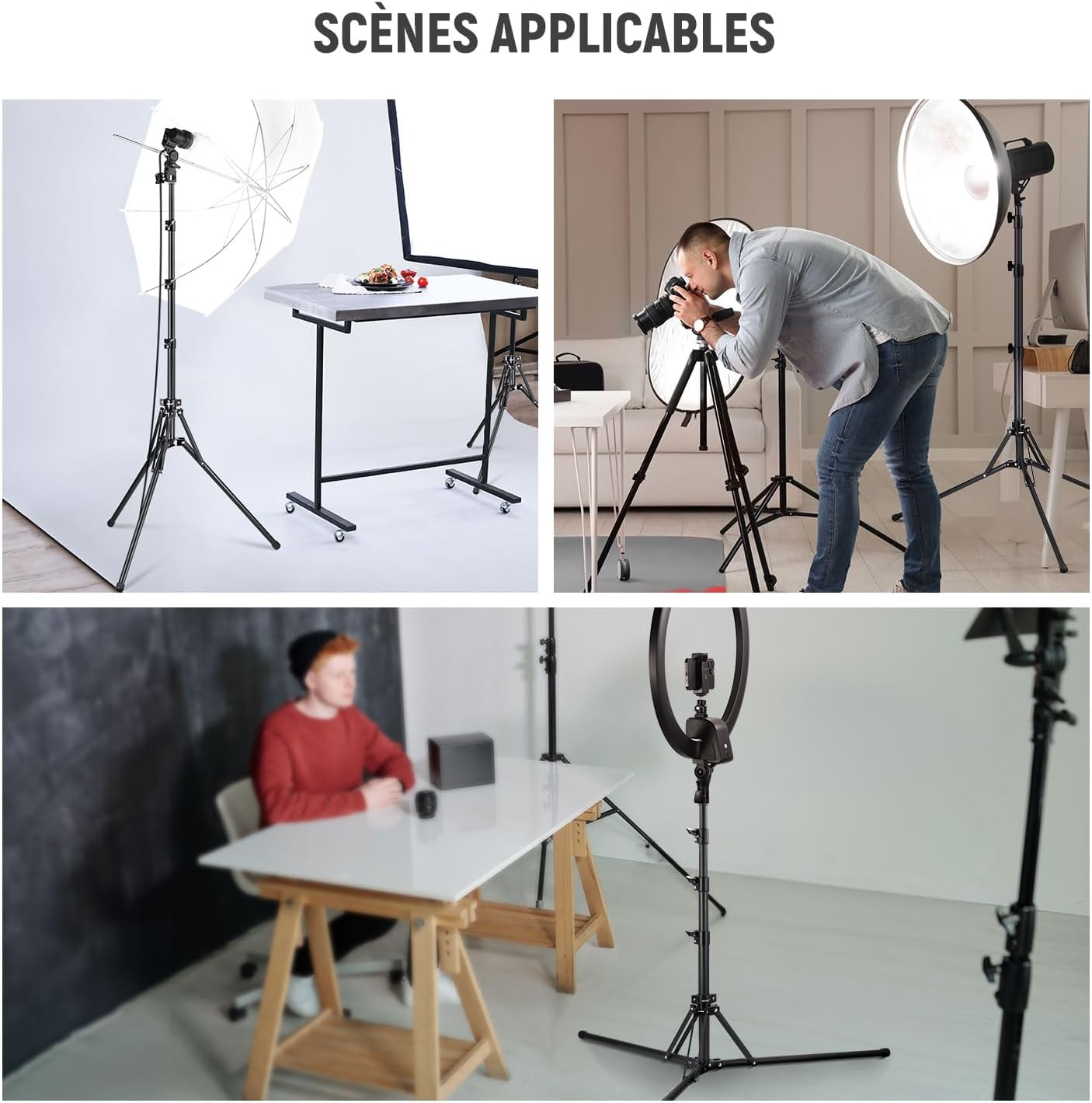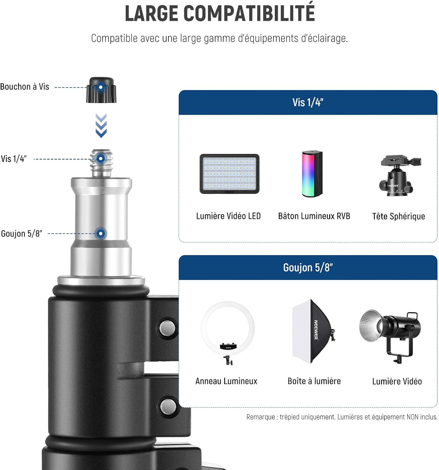 - 【Pointe de Vis Universelle 1/4"】la vis 1/4" et le goujon 5/8" conviennent à une large gamme d'appareils, y compris les anneaux lumineux, les lumières vidéo LED, les stroboscopes, les monolights, les caméras d'action, les boîtes à lumière, les réflecteurs et les parapluies photographiques.