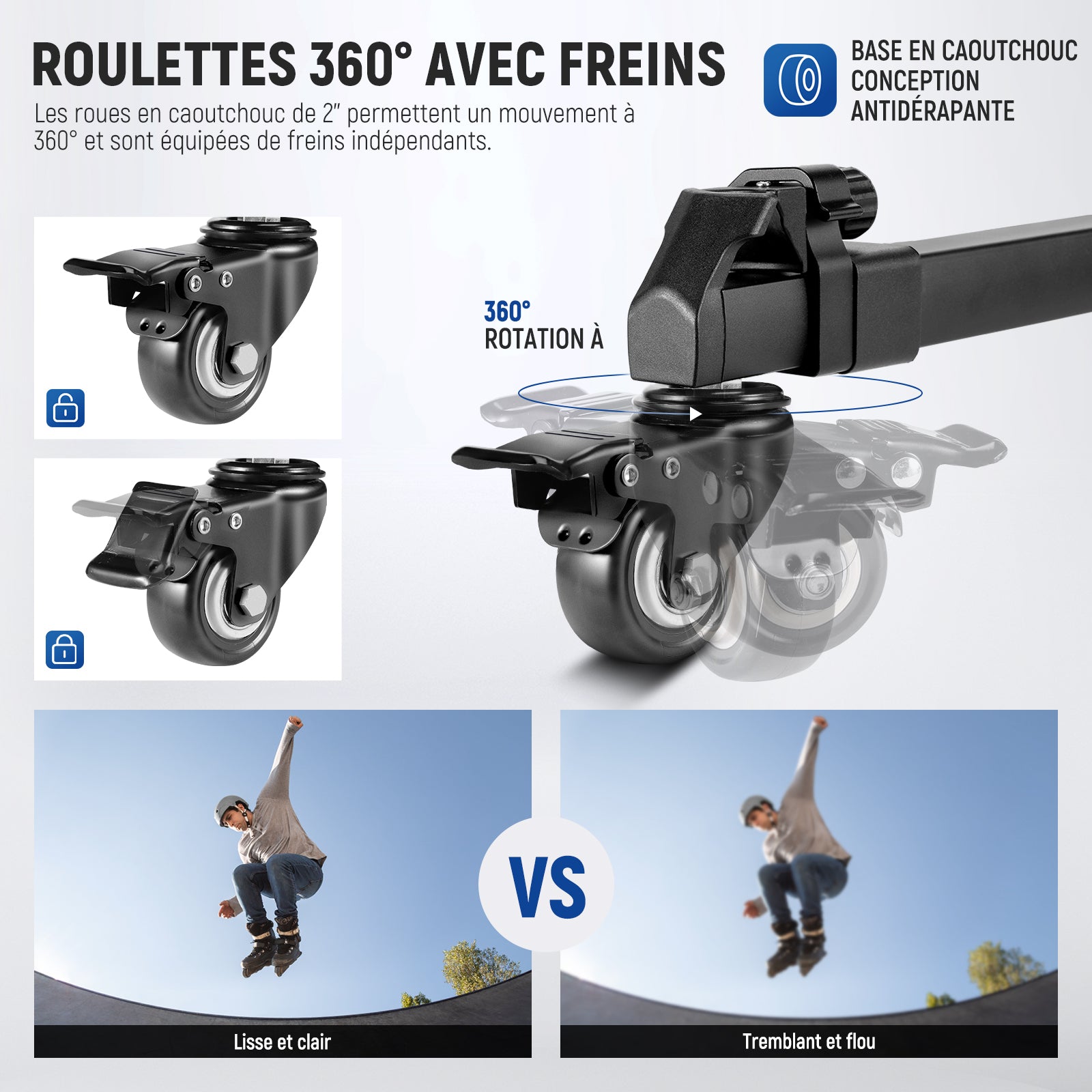 - 【Roues à 360° avec freins】 Les roues en caoutchouc de 2 pouces avec mouvements à 360° et freins individuels font glisser l'équipement lourd dans n'importe quelle direction et se fixent avec un minimum d'effort. Les roulettes à roulement à billes en métal assurent un roulement en douceur sur toute surface dure